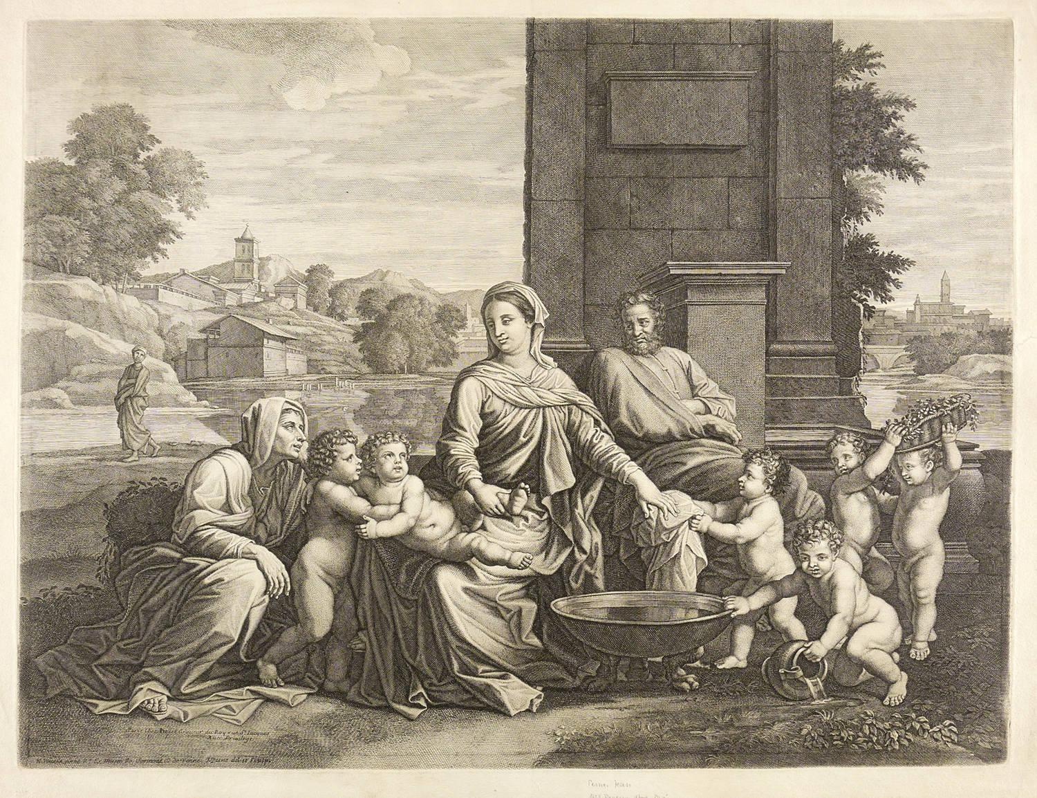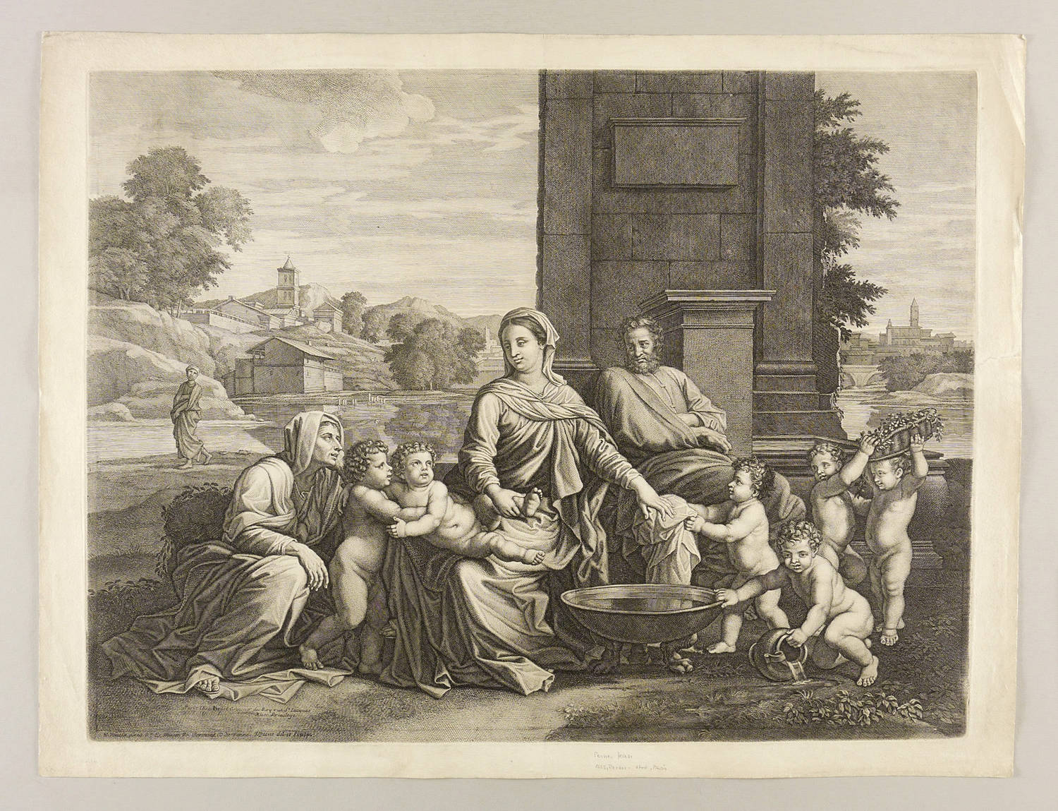 Nicolas Poussin (1594 Les Andelys - 1665 Rom). Französischer Maler. Seine malerische Ausbildung erhielt er zwischen 1612 und 1621 in Rouen und Paris. Im der Folge der Ausstattung des Palais du Luxembourg, bekam Poussin 1622 einen ersten größeren Auftrag zusammen mit Philippe de Champaigne. Im selben Jahre lernte er Giambattista Marino in Paris kennen. Über ihn wurde er mit der griechischen und römischen Mythologie vertraut. Zudem wurde Poussin von diesem dem Kardinal Giulio Sacchetti in Rom empfohlen. Von letzterem wurde er an Francesco Barberini weiter vermittelt. Poussin wurde bekannt mit Jacques Stella, Claude Lorrain, mit Cassiano dal Pozzo, dem Sekretär Kardinal Barberinis und den deutschen Maler Joachim Sandrart. Er studierte in Rom die zeitgenössige Malerei und die Kunst der Antike. Zunächst hatte Poussin Schwierigkeiten sich gegen etablierte Künstler durchzusetzen. 1627 erhielt er durch Empfehlung Gian Lorenzo Berninis den Auftrag eines Altargemäldes St. Peter mit dem Martyrium der Hl. Erasmus. 1631 wurde er Mitglied der Accademia di San Luca. In der Folge wurde Poussin auch für private Sammler tätig. 1641 kehrte auf den Wunsch Ludwigs XIII. und dem Drängen Kardinal Richelieus nach Paris zurück. Dort erhielt er die Leitung der Ausstattung der königlichen Bauten. Spannungen zwischen ihm und etablierten französischen Malern und die ihm widerstrebende Tätigkeit, ließen ihn Ende 1642 endgültig nach Rom zurückkehren. Hier wurde er wiederrum für private Auftraggeber wie Giulio Rospigliosi (später Papst Clemens IX.), Gian Maria Roscioli, dem päpstlichen Kanzler, und Duc de Créqui und Henri Valencay, französische Botschafter am Vatikan, tätig. Seit den späten 1630ger Jahren dehnte sich der Kreis seiner Mäzene auch auf Paris aus. So hatte Poussin u.a. in Paul Fréart de Chantelou und dem Bankier Jean Pointel finanzkräftige Sammler. 1665 erfuhr er eine späte Ehrung in der Bestätigung als „Erster Maler Frankreichs“ durch Ludwig XIV.