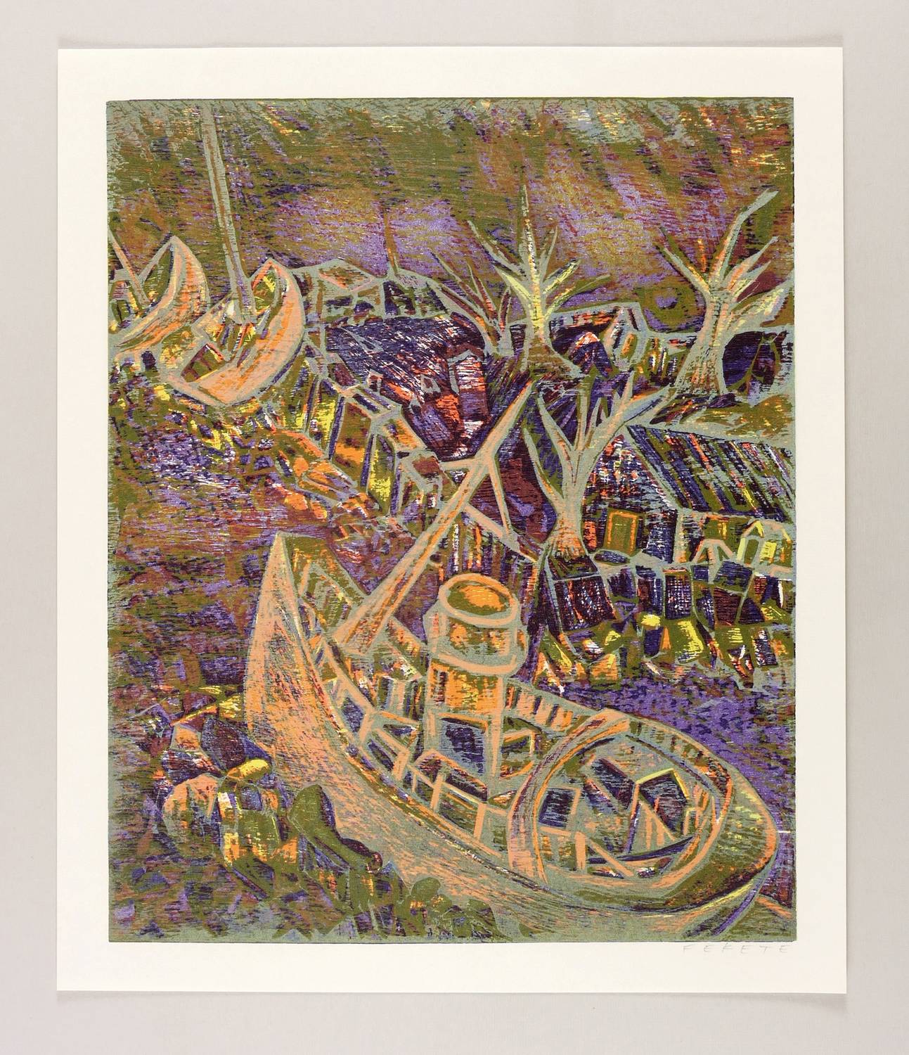 1986. Farbholzschnitt, in 7 Farben, auf hellchamois Werkdruck. – Originale Künstlergrafik, von Esteban Fekete. – 55,3 x 45,0 cm (Darstellung / Druckstock), 62 x 52 cm (Blatt).