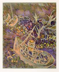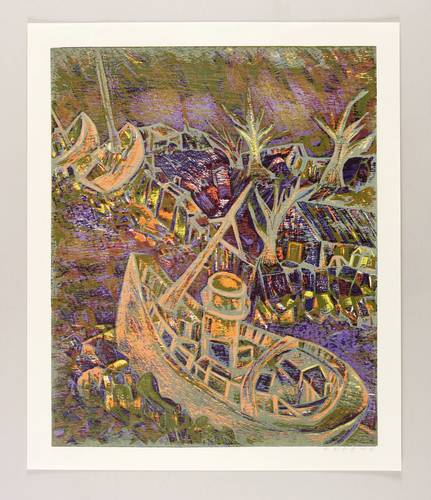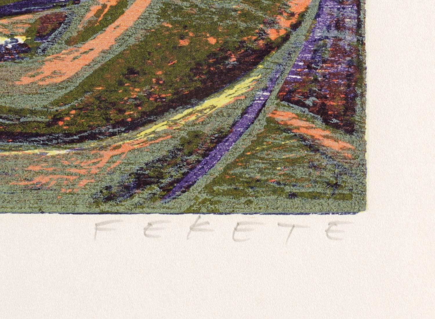 Esteban Fekete (1924 Cinkota / Budapest - 2009 Dieburg). Deutsch-argentinischer Maler, Zeichner und Grafiker. Arbeitete in verschiedenen Techniken wie Öl und Tempera, aber auch in Mischtechniken auf Papier, Holz oder Hartfaser. Anfang der 1970er Jahre entstanden Email-Bilder, Zeichnungen und Linolschnitt. Seine ureigene Technik ist allerdings der Holzschnitt, insbesondere der Farbholzschnitt, mit dem er sich einen Namen machte. So entwickelte er eine eigene Schnitt- und Bearbeitungstechnik für die Holzplatten. Für die Farbgebung verwendete er eigens dafür gesuchte Ölfarben.