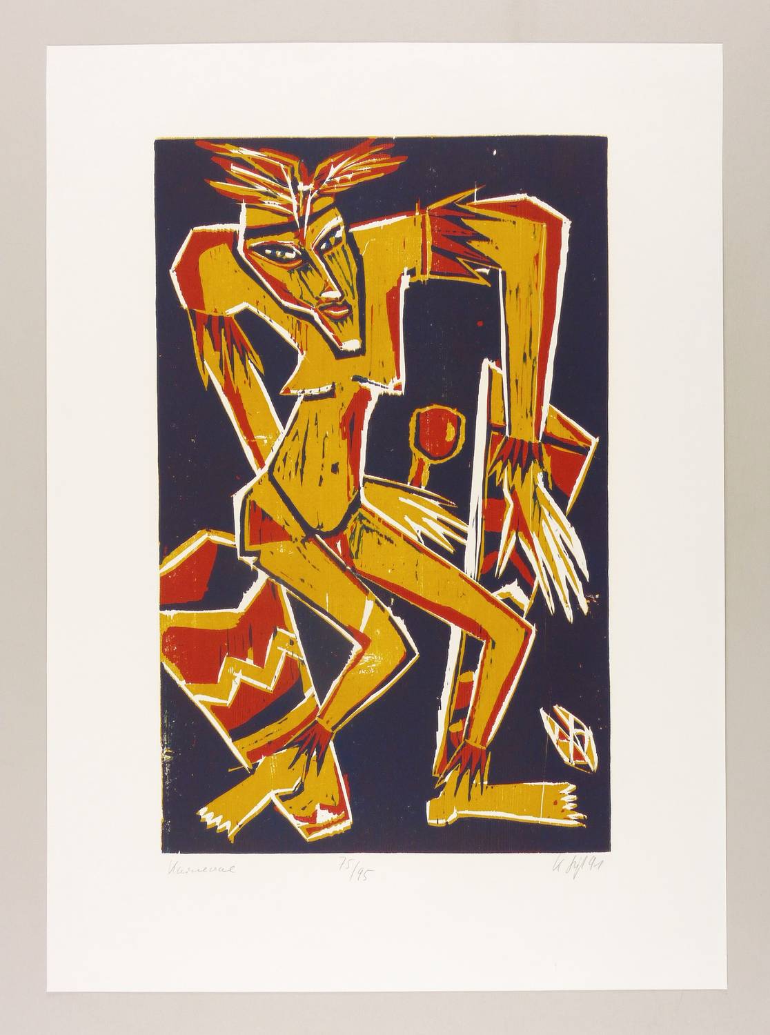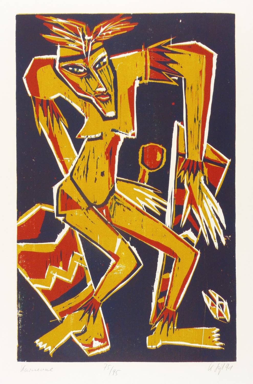 1991. Farbholzschnitt, in 3 Farben, auf weißem Werkdruck. – Originale Künstlergrafik, von Klaus Süß. – Auflage Exemplar Nr. 75/95. – 59,4 x 37,3 cm (Darstellung / Druckbild), 79 x 57 cm (Blatt).