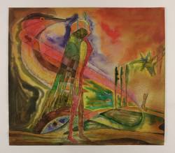 1983. Mischtechnik / Aquarell & Farbkreide, über Graphit, auf getöntem Maschinenbütten. – Originale Künstlergrafik, von Günther Huniat. – Unikat. – 58,8 x 66,3 cm (Darstellung / Blatt).