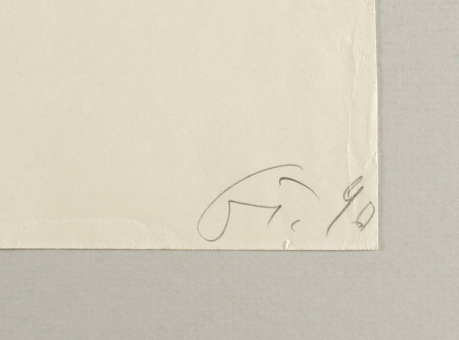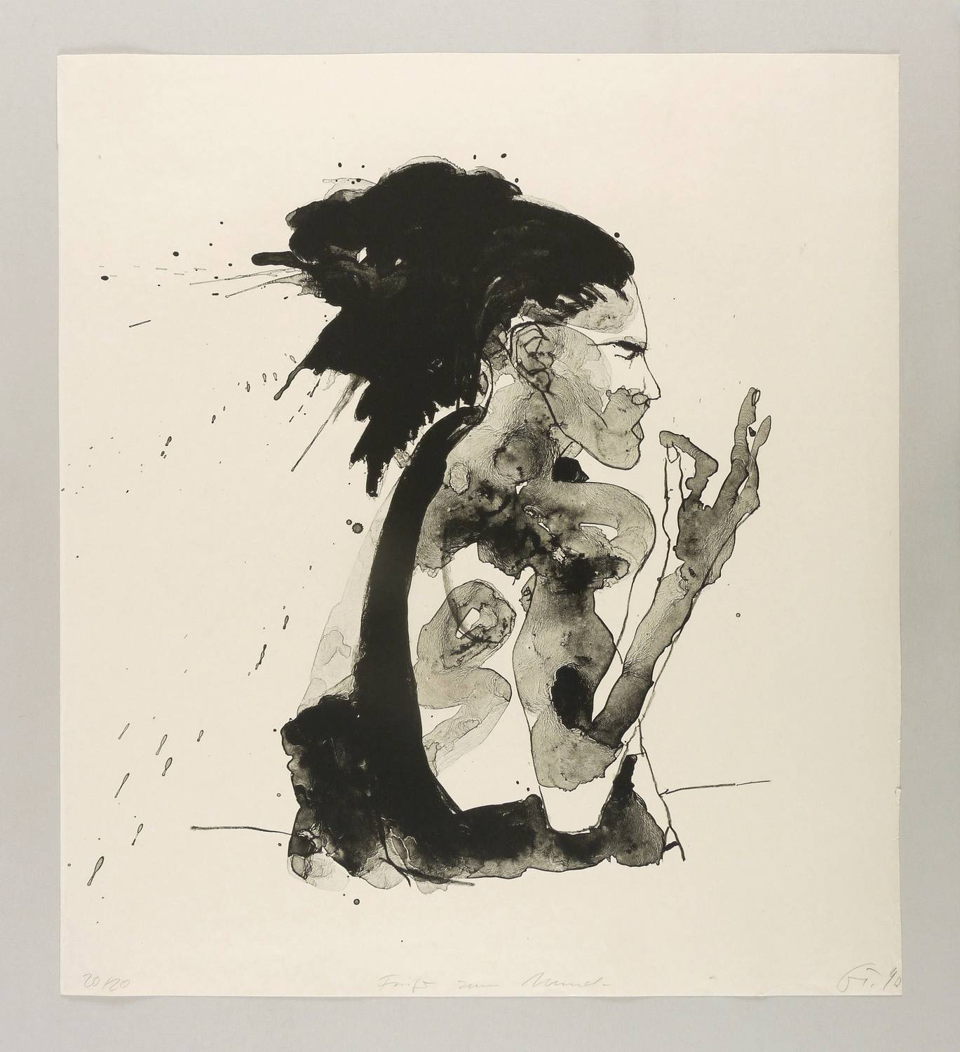 Rechts unten in Bleistift signiert und datiert: ″GT 90″. Links Auflagenbezeichnung: ″20/20″. Mittig Titel: ″Finger zum Mund″. – Umlaufend Randmängel. Mäßig guter Zustand.