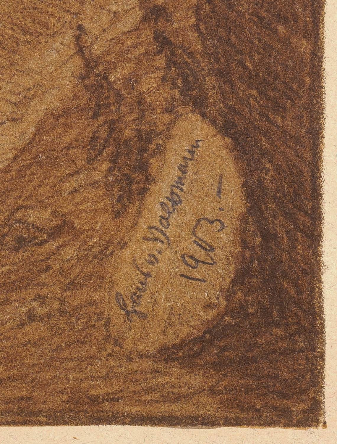In der Darstellung rechts unten in der Steinplatte in Bleistift signiert und datiert: ″Hans v. Volkmann 1903″. Links eigenhändiger Titel. Im Stein darüber Signatur und Jahr: ″HR. v. Volkmann. 1902″. Verso Stempel der Kunstdruckerei Künstlerbund Karlsruhe (KKK) mit handschriftlicher Katalognummer ″RR 60″. – Blattrand etwas knickspurig. Zwei winzige Einrisse im unteren Rand. Sonst gut erhalten.