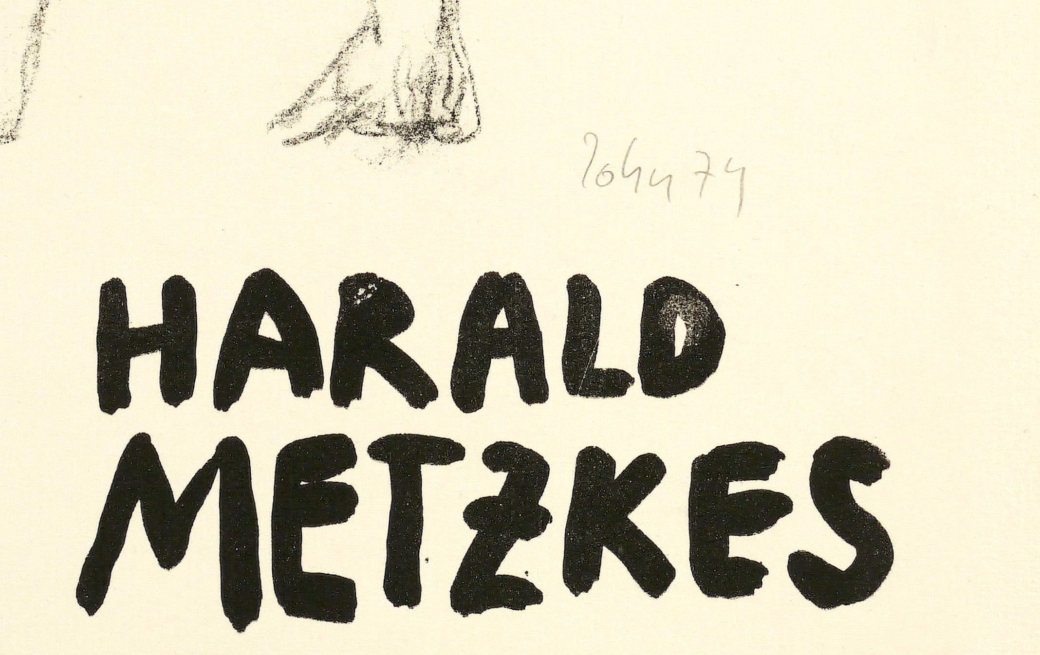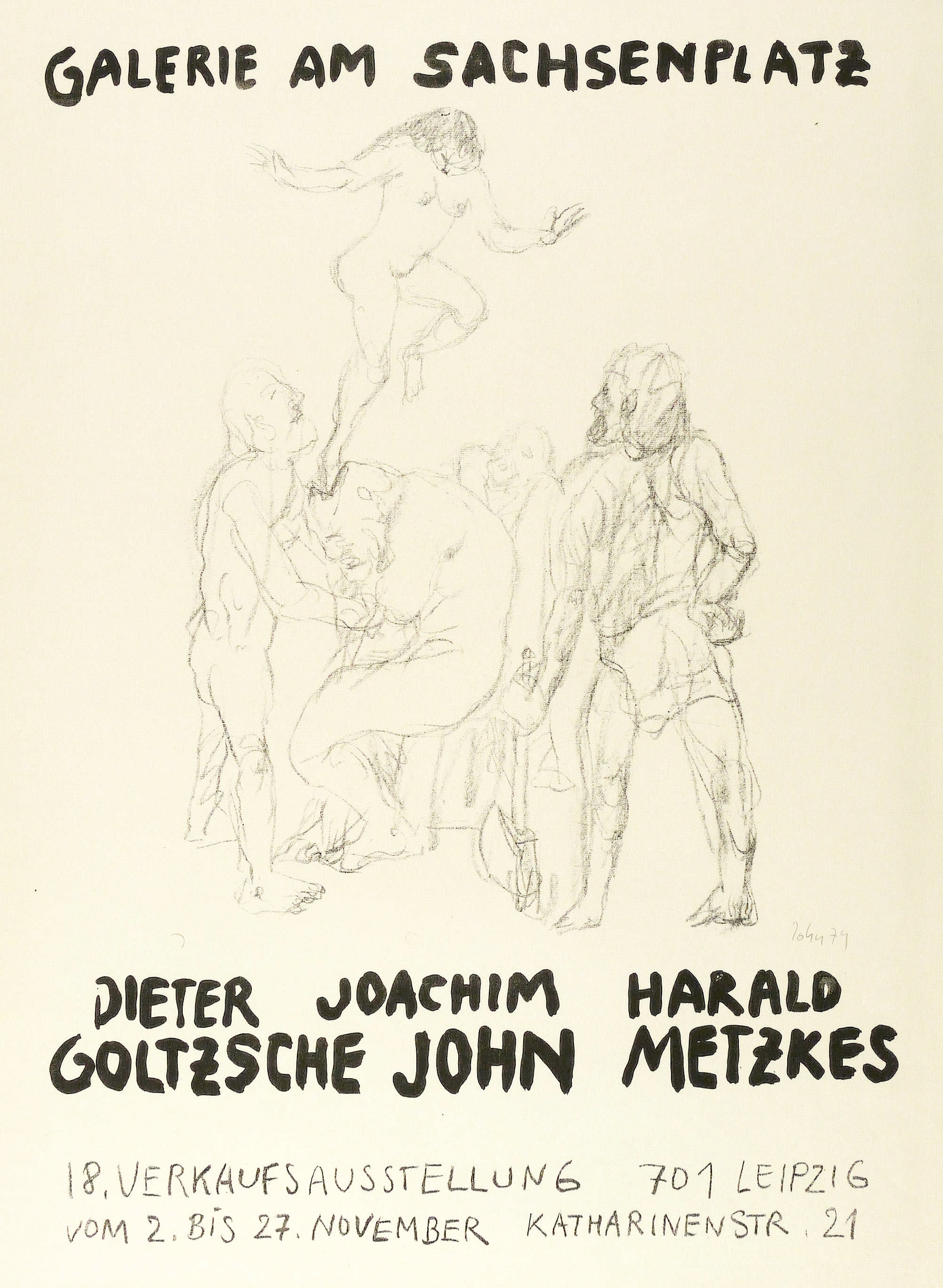 Rechts unten in Bleistift signiert und datiert. – Originalgrafisches Künstlerplakat zur Gruppenausstellung von Dieter Goltzsche, Joachim John und Harald Metzkes in der Galerie am Sachsenplatz in Leipzig 1974. – Eselsohr rechts oben. Im Randbereich etwas knickspurig. Mäßig guter Zustand.