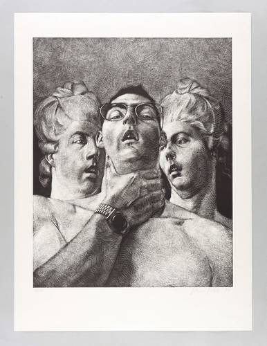 1974. Lithografie / Kreidelithografie, in Schwarz, geschabt, auf hellem Velin. – Originale Künstlergrafik, von Johannes Grützke. – Auflage Exemplar Nr. 68/100. – 59,8 x 47,9 cm (Darstellung / Druckbild), 76 x 57 cm (Blatt).