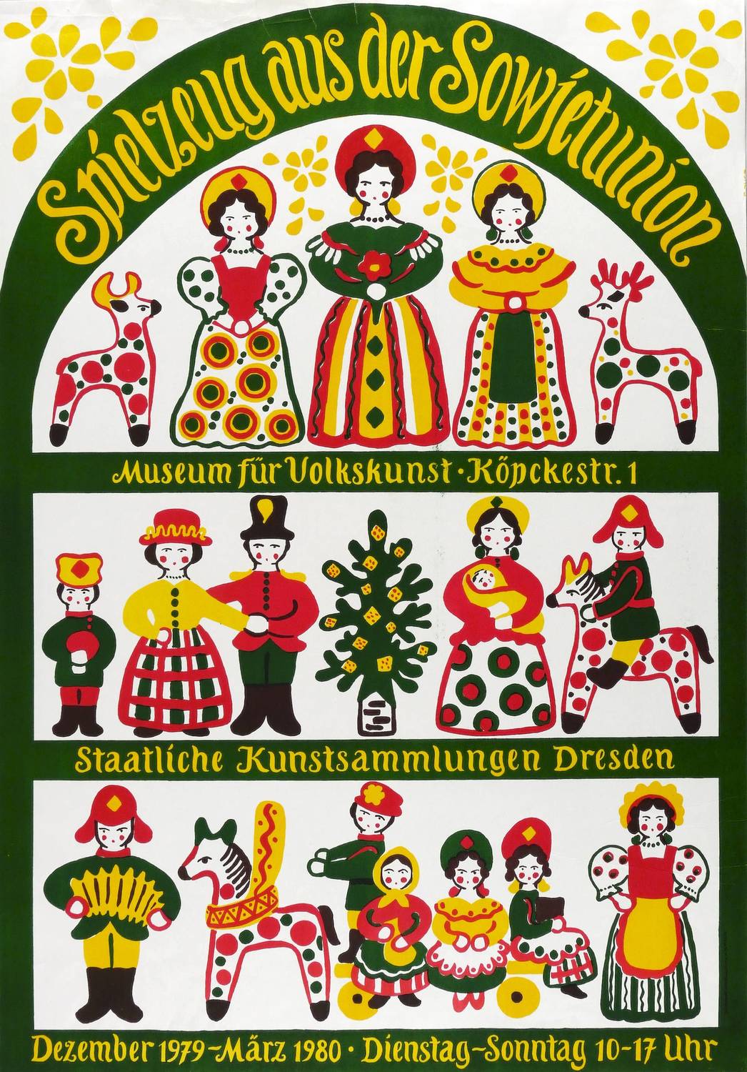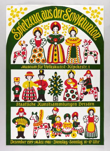 In der Druckform rechts unten typografische Signatur: ″P. HERRMANN″. Diverse Inschriften. – Plakat zur Ausstellung ″Spielzeug aus der Sowjetunion″ im Museum für Volkskunst im alten Jägerhof Dresden Dezember 1979 bis März 1980. – Leichte Randmängel. Insgesamt guter Zustand.