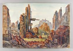 Links unten in Pinsel in Braun signiert: ″IRMGARD UHLIG″. – Unikate Arbeit zur Zerstörung Dresdens durch Bombenkrieg. Irmgard Uhlig ging nach ihrer Rückkehr 1945 in Bergstiefeln durch die kriegsversehrte Heimatstadt, ″stieg über die Trümmerberge und malt. Die stehengebliebenen Schornsteine und Häuserecken, die Ziegelklopfer. Und die Zeichen beginnenden Lebens, die blühenden Unkrautfelder zwischen den Ruinen (Ingrid Roßki, Bankpapiere trieben im Feuersturm, in: Sächsische Zeitung v. 10. Februar 2000, S. 11). Ein Großteil der dabei entstandenen etwa 60 Bilder befindet sich heute im Stadtmuseum Dresden. – Farbfrisch und kontrastreich erhalten. Sehr guter Zustand.