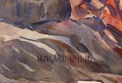 Irmgard Uhlig (1910 Oberwiesenthal - 2010 Dresden). Deutsche Malerin und Grafikerin. Passionierte Bergsteigerin und bedeutende Malerin der Sächsischen Schweiz. Nach dem frühen Tod des Vaters 1915 Umsiedelung nach Nossen. 1930-33 Studium der Fächer Kunsterziehung und Geografie am Pädagogischen Institut der Technischen Hochschule in Dresden. 1933-45 Kunsterzieherin in Dresden. Später Aushilfslehrerin in zahlreichen Schulen in Dresden und der Sächsischen Schweiz. Oft verknüpfte sie ihre Passion des Bergsteigens mit dem Malen von ungezählten Aquarellen. Im März 1945 Rückkehr in das zerbombte Dresden. Ab 1946 als freischaffende Künstlerin Entwurf von Handpuppen für einen Spielzeugbetrieb, Mitarbeit bei einem Landschaftsarchitekten, bis zur endgültigen Hinwendung zur Malerei. Später war Uhlig wie bereits um 1933 vor allem im heimischen Elbsandsteingebirge unterwegs. Auch hier verknüpfte sie ihre Leidenschaften Klettern und Malen. Mitglied der Akademie der Künste der DDR.
