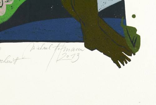 2013. Farbholzschnitt, auf Bütten. – Originale Künstlergrafik, von Michael Hofmann. – Auflage Exemplar Nr. 5/10. – 44,0 x 37,8 cm (Darstellung / Druckstock), 68,5 x 53,5 cm (Blatt).
