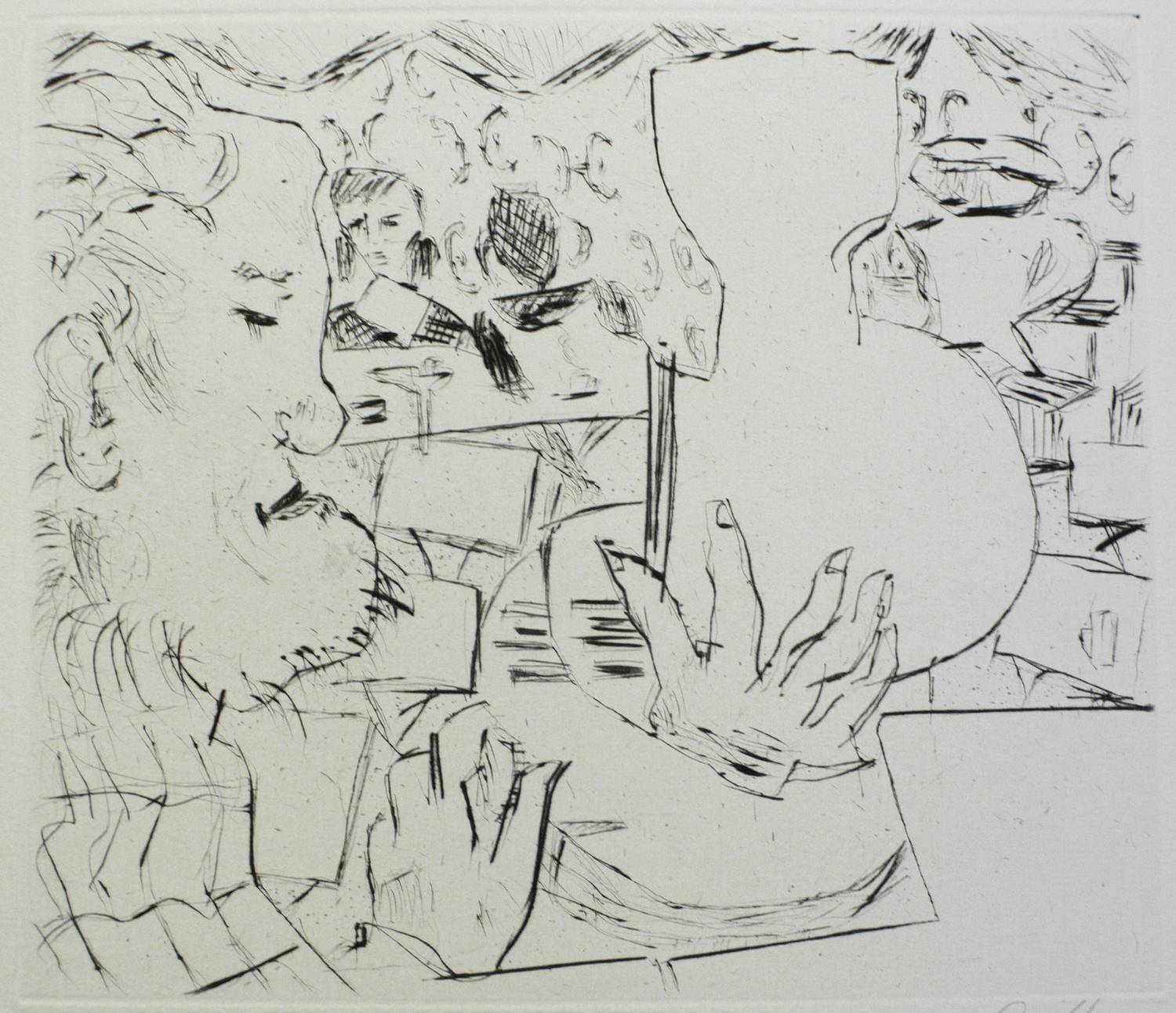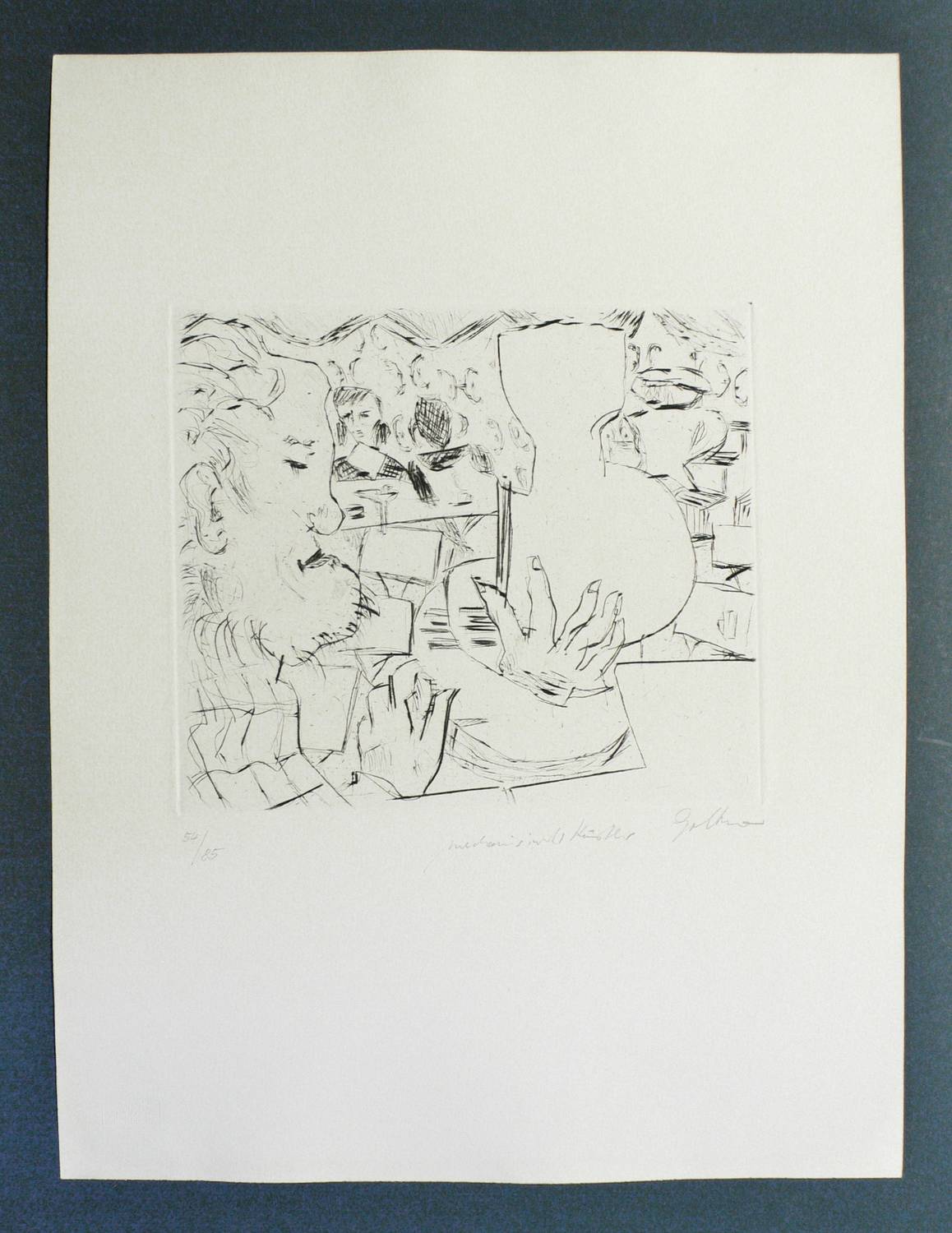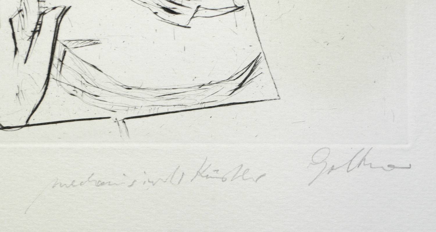 Um 1985. Radierung / Strichätzung, in Schwarz, auf hellchamois Velin. – Originale Künstlergrafik, von Dieter Goltzsche. – Auflage Exemplar Nr. 54/85. – 19,3 x 22,2 cm (Darstellung / Platte), 44 x 33 cm (Blatt).