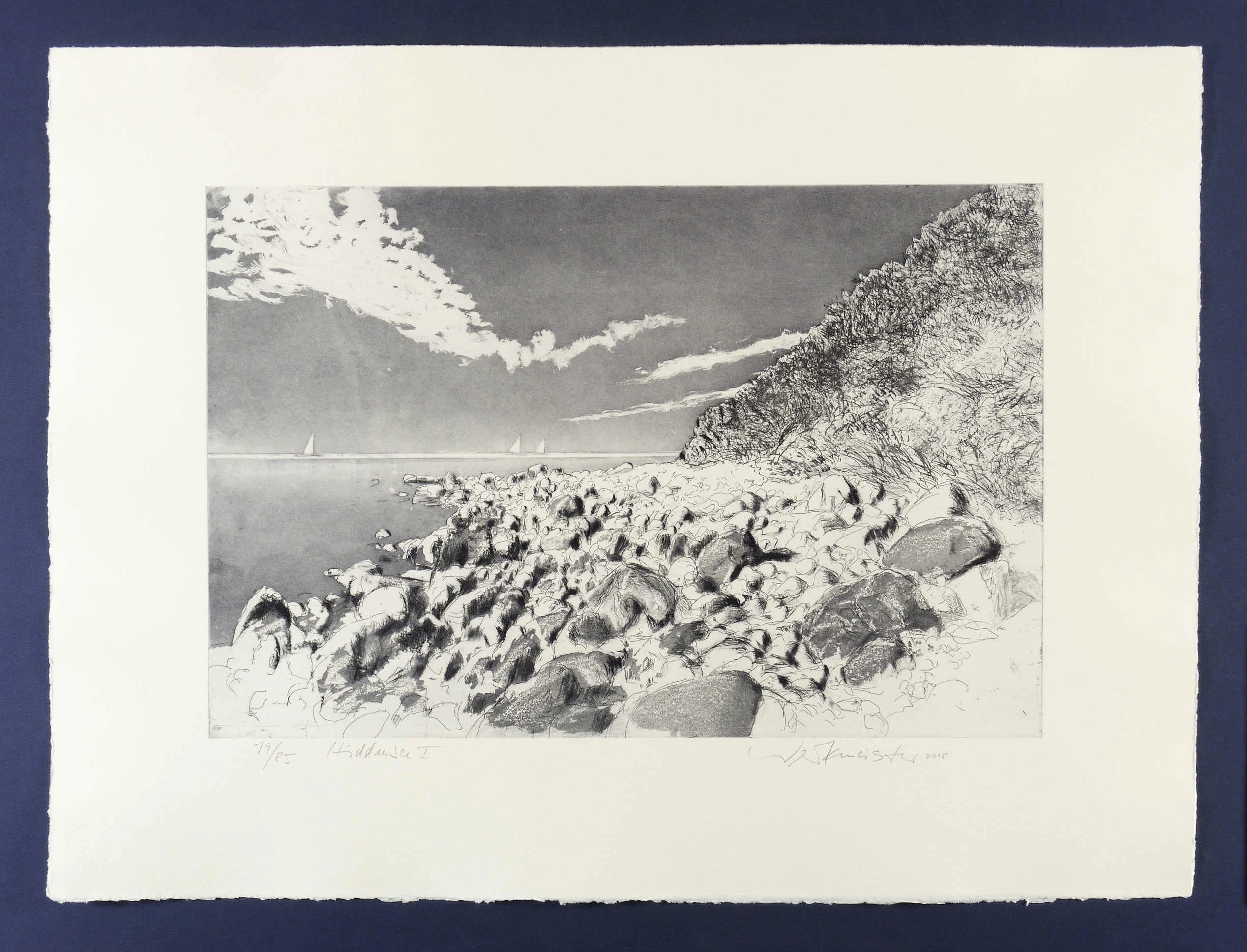 Wolfgang Werkmeister (*1941 Berlin, lebt und arbeitet in Hamburg). Deutscher Grafiker, bedeutender Vertreter der zeitgenössischen Radierkunst. 1960-64 Besuch der Akademie der Bildenden Künste Stuttgart, Fachklasse für freie Grafik und Illustration bei Gunther Böhmer. 1965 Besuch der Fachhochschule für Gestaltung Hamburg bei W. M. Busch und S. Oelke. 1966-68 tätig als Pressezeichner. 1972/73 Dozent an der Fachhochschule für Gestaltung, Hamburg. Zahlreiche Auslanfsaufenthalte und Stipendien in Marokko, USA, auf den Kanarischen Inseln, etc. 2001 Kunstpreis der Stadt Baden-Baden. Zentrales Ausdrucksmittel ist die Radierung, genauer die Aquatinta, in der er Landschaft als Hauptmotiv regelrecht zelebriert und in technisch ebenso aufwändigen wie raffinierten Blättern druckgrafisch umsetzt. Stilistisch siedelt sein Werk zwischen einem geschickt eingesetzten Fotorealismus und der lakonischen Bildsprache eines Ansel Adams.