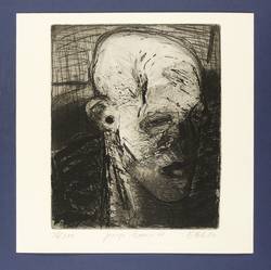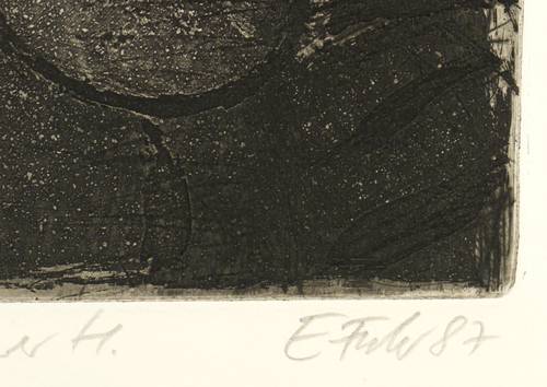 1987. Radierung / Strichätzung & Reservage, in Schwarz, auf hellgelbem Velin. – Originale Künstlergrafik, von Ellen Fuhr. – Auflage Exemplar Nr. 56/200. – 30,7 x 25,5 cm (Darstellung / Platte), 36 x 36 cm (Blatt).