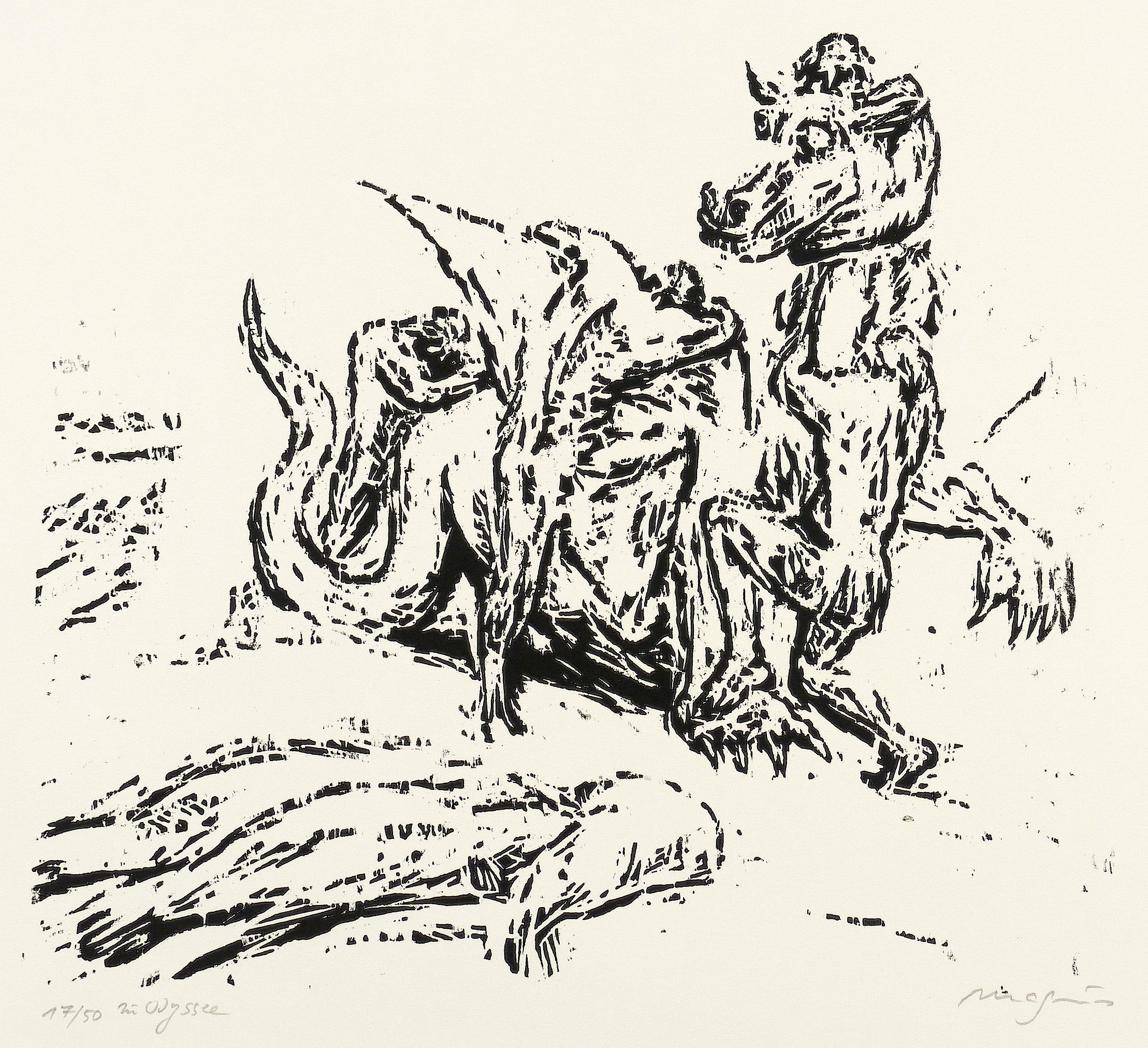 1977. Holzschnitt, in Schwarz, auf hellchamois Velin. – Originale Künstlergrafik, von Klaus Magnus. – Auflage Exemplar Nr. 17/50. – 22,9 x 25,2 cm (Darstellung / Druckbild), 30 x 42 cm (Blatt).
