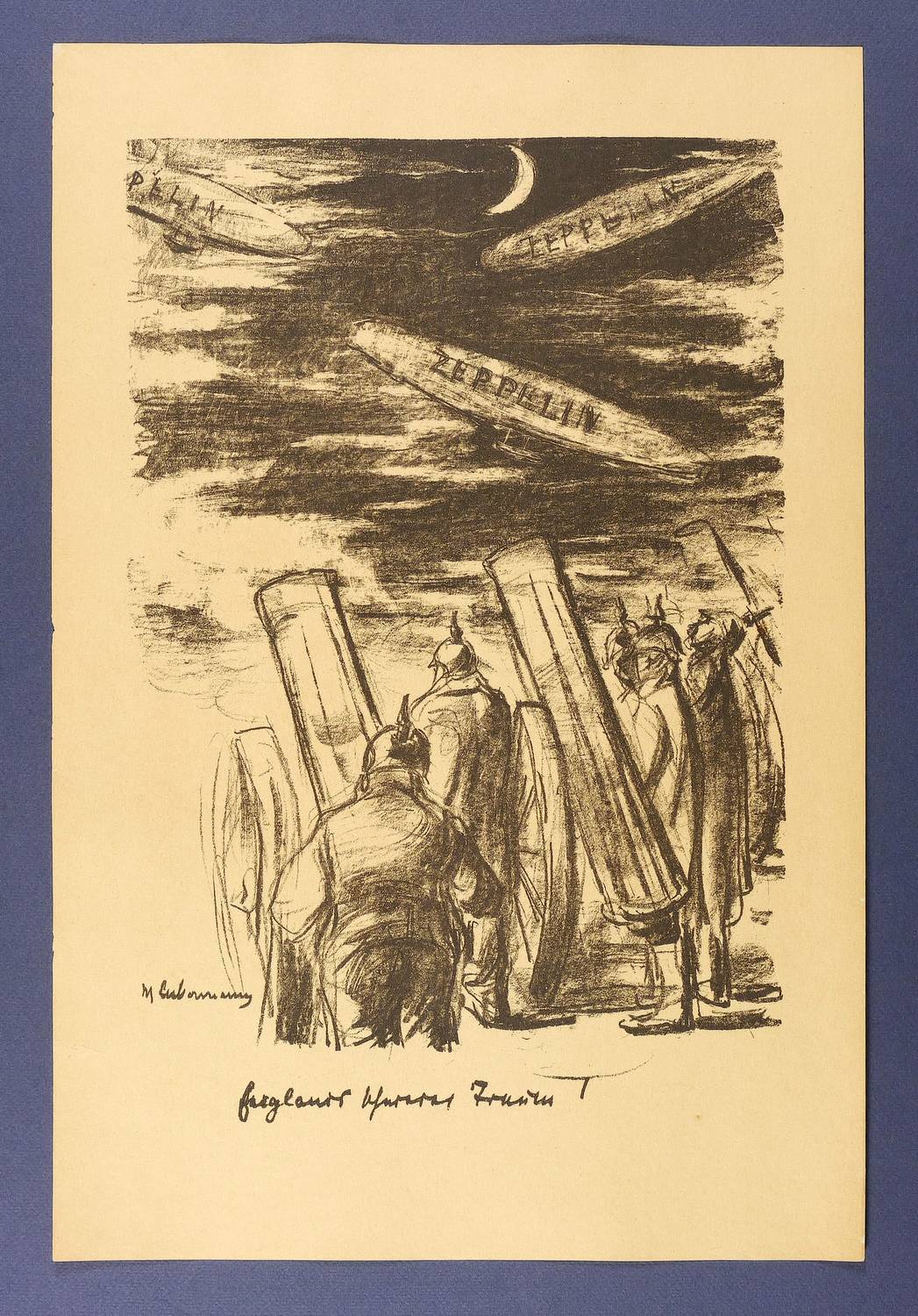 Jentsch 23. Söhn 13406-3. Schiefler 1786. – Aus: Kriegszeit. Künstlerflugblätter (Berlin: Paul Cassirer & Alfred Gold 1914-1916). – Nicht handsigniert. Im Stein links unten signiert: M. Liebermann″. Unterhalb Titel. – Deutsche Artillerie beobachtet drei Zeppelin- Flugschiffe bei Nacht. – Gut erhalten.