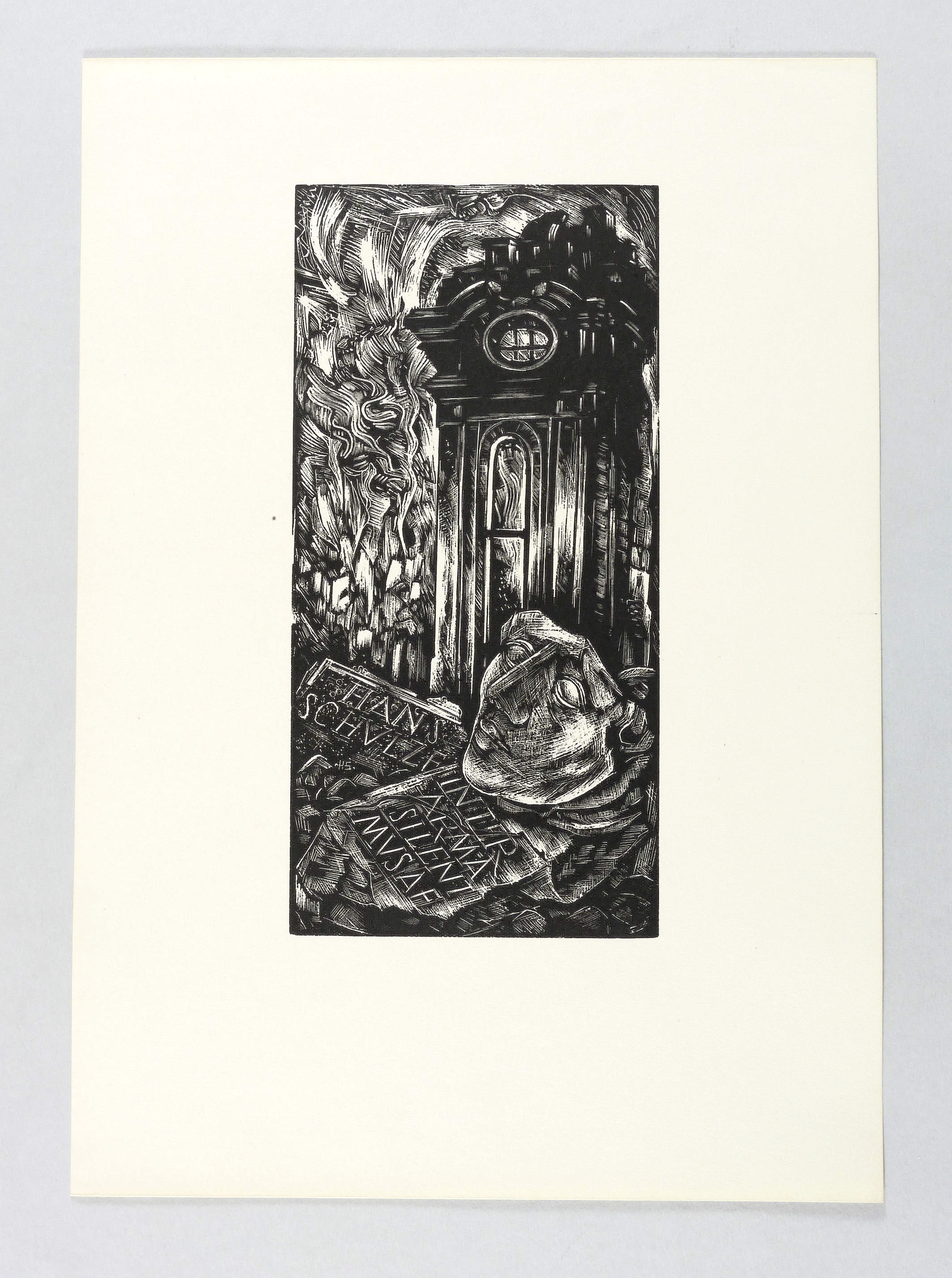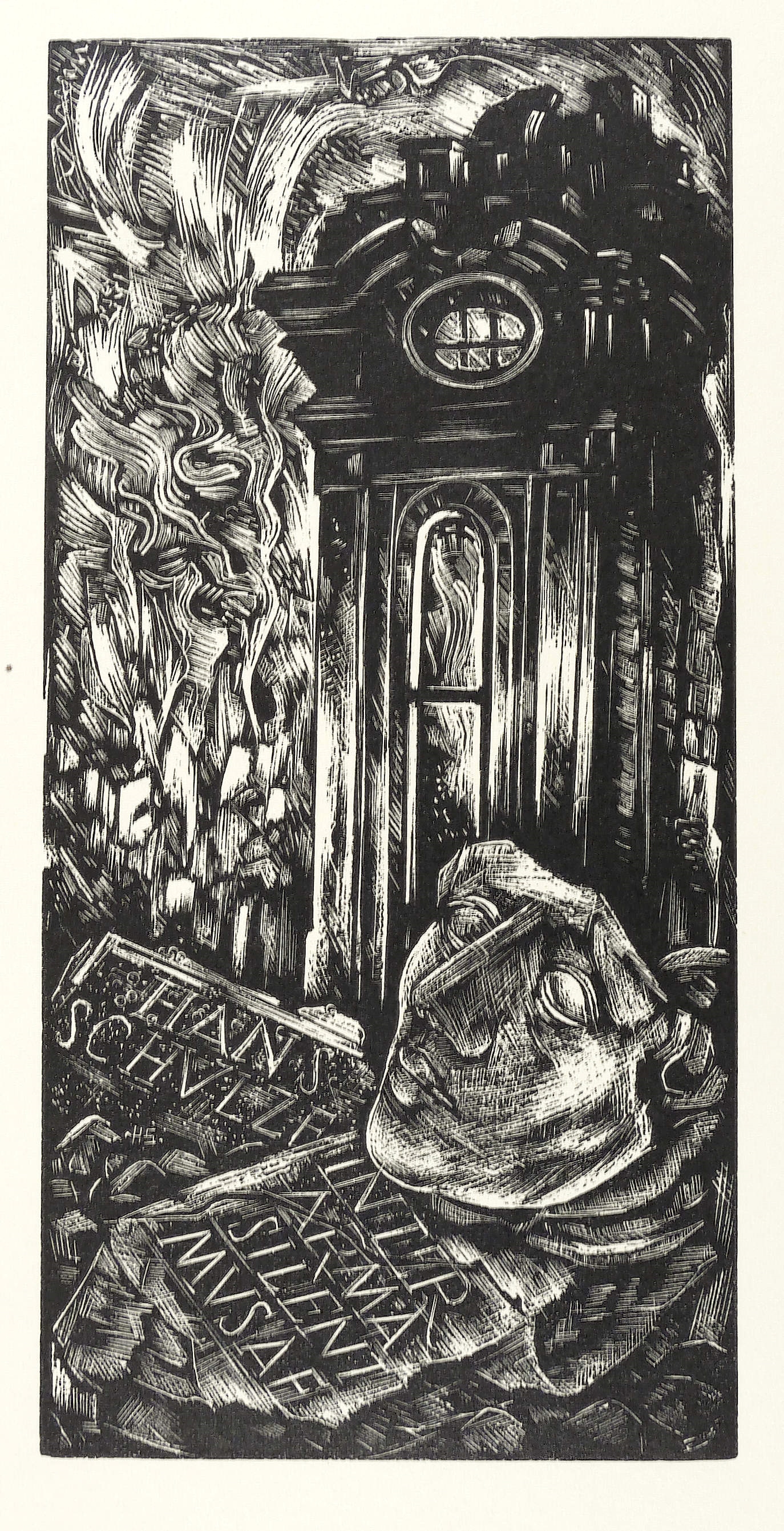 1945-1950. Linolschnitt, in Schwarz, auf leichtem gelblichem Werkdruckpapier. – Originale Künstlergrafik, von Hans Schulze. – 19,5 x 9,5 cm (Darstellung / Druckstock), 30 x 21 cm (Blatt).