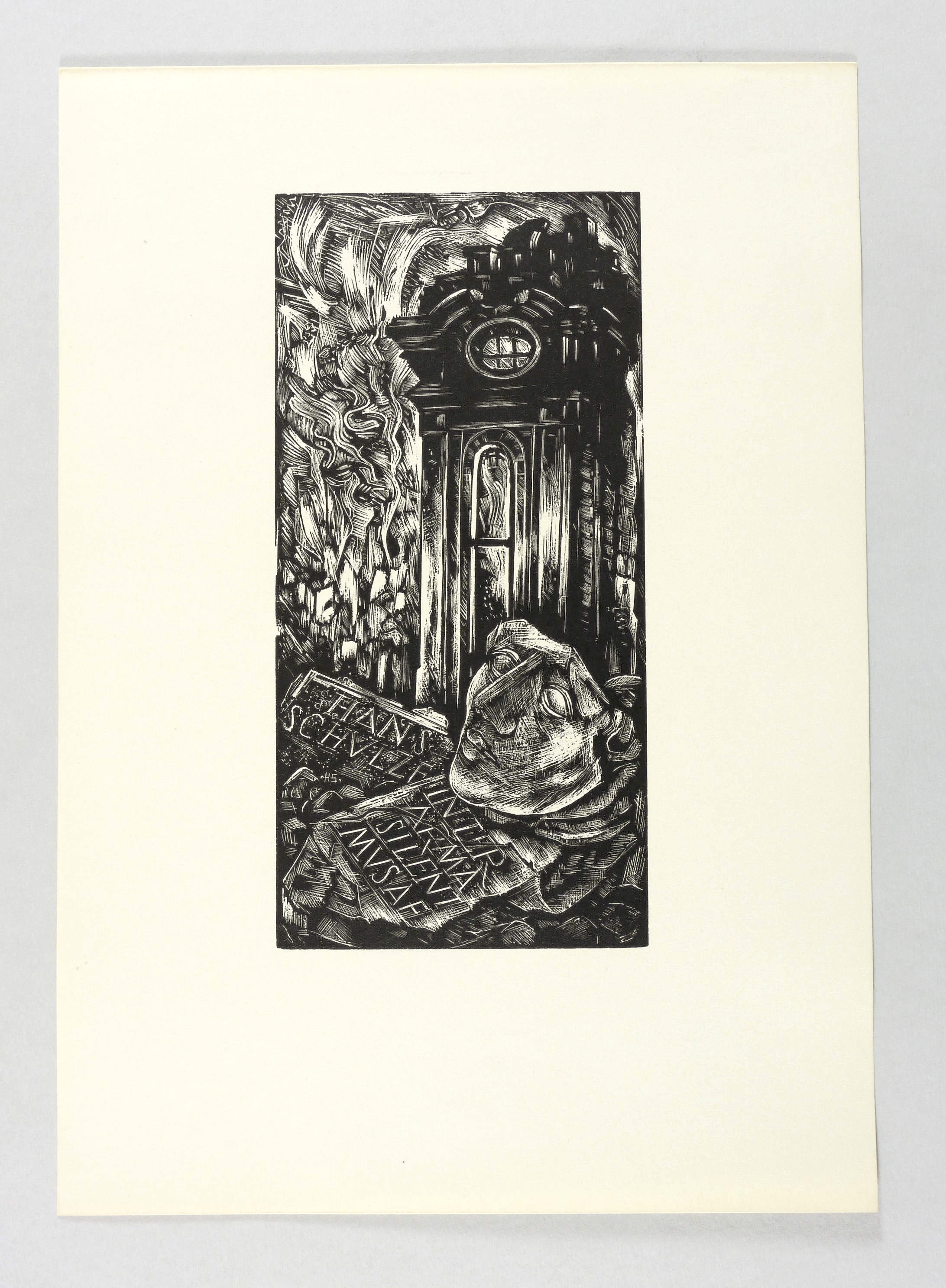 1945-1950. Linolschnitt, in Schwarz, auf leichtem gelblichem Werkdruckpapier. – Originale Künstlergrafik, von Hans Schulze. – 19,5 x 9,5 cm (Darstellung / Druckstock), 30 x 21 cm (Blatt).