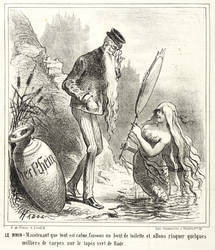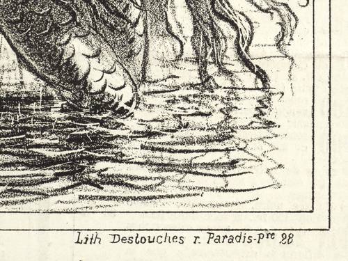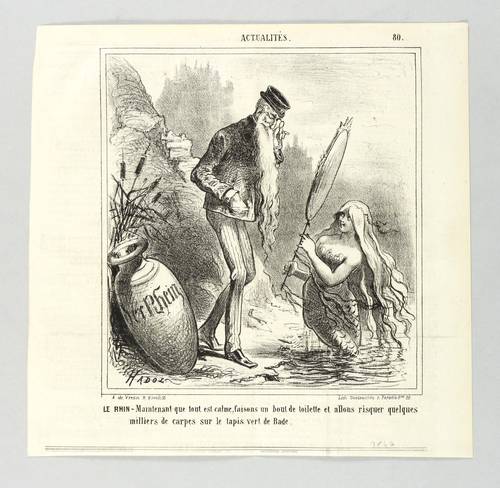 Aus: Le Charivari (Paris: 1832-1937). – Im Stein links unten signiert: ″HADOL″. Darüber auf dem Krug bezeichnet: ″Der Rhein″. Oberhalb typografischer Serientitel, unterhalb Titel und Inschrift: ″Le Rhin - Maintenant que tout est calme, faisons un bout de toilette et allons risquer quelques milliers de carpes sur le tapis veert de Bade.″ – Erschienen als Blatt Nr. 80 der Serie ″Actualités″ im Charivari. – Sehr guter Erhaltungszustand.