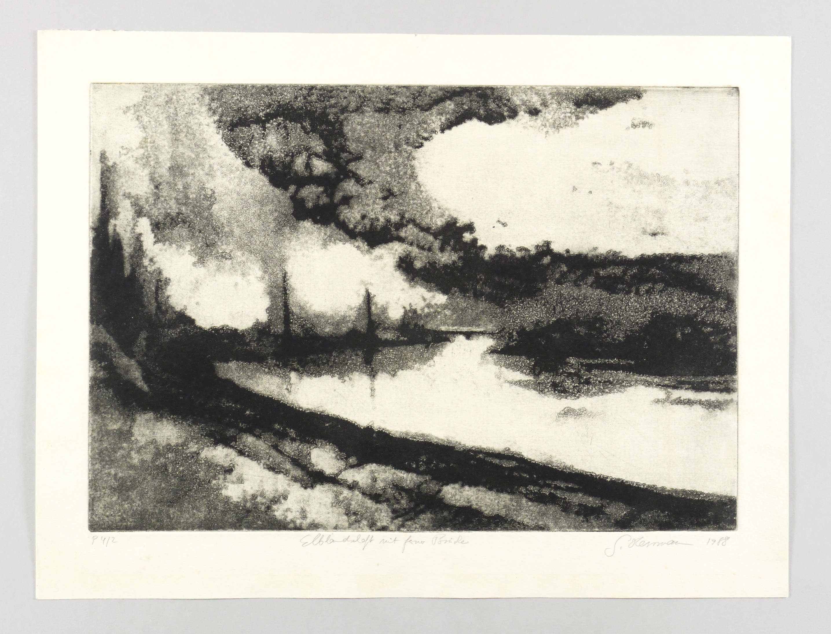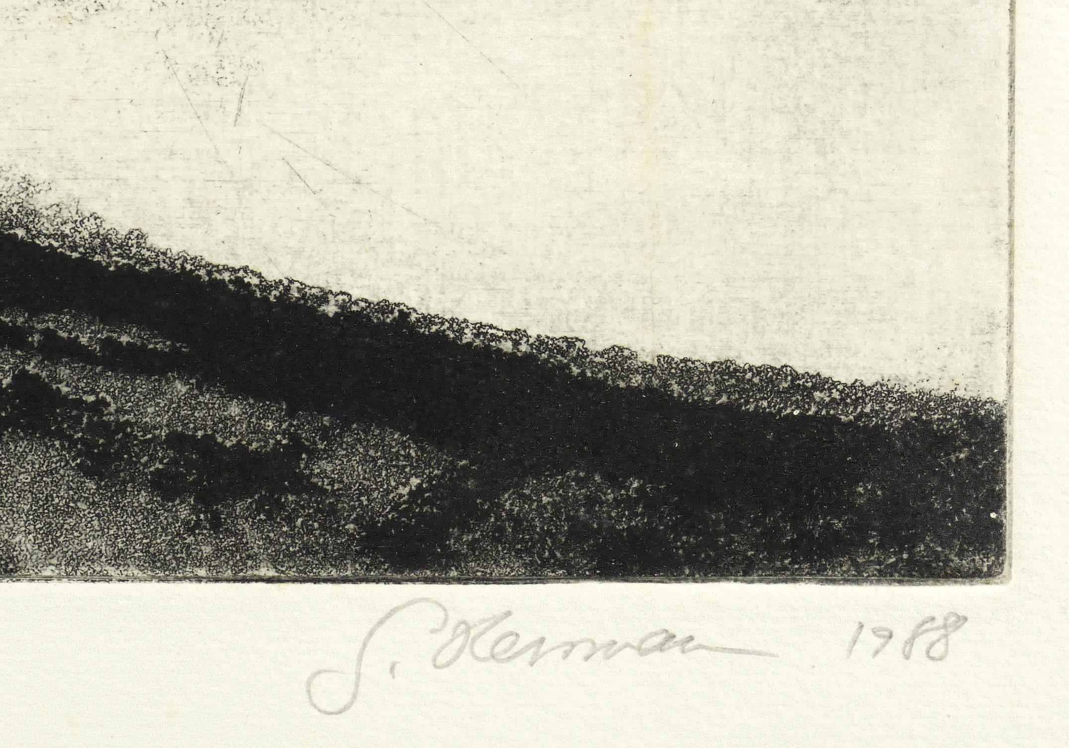 1988. Radierung / Aquatinta, in Schwarz, auf Hahnemühle-Bütten. – Originale Künstlergrafik, von Gunter Herrmann. – Auflage Exemplar Nr. 2/4. – 27,4 x 39,7 cm (Darstellung / Platte), 35 x 46 cm (Blatt).