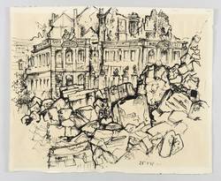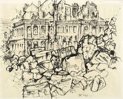 1948. Zeichnung / Rohrfeder, in schwarzer Tusche, auf gelbem Velin. – Originale Künstlergrafik, von Hans Schulze. – Unikat. – 40,0 x 48,2 cm (Darstellung / Blatt).