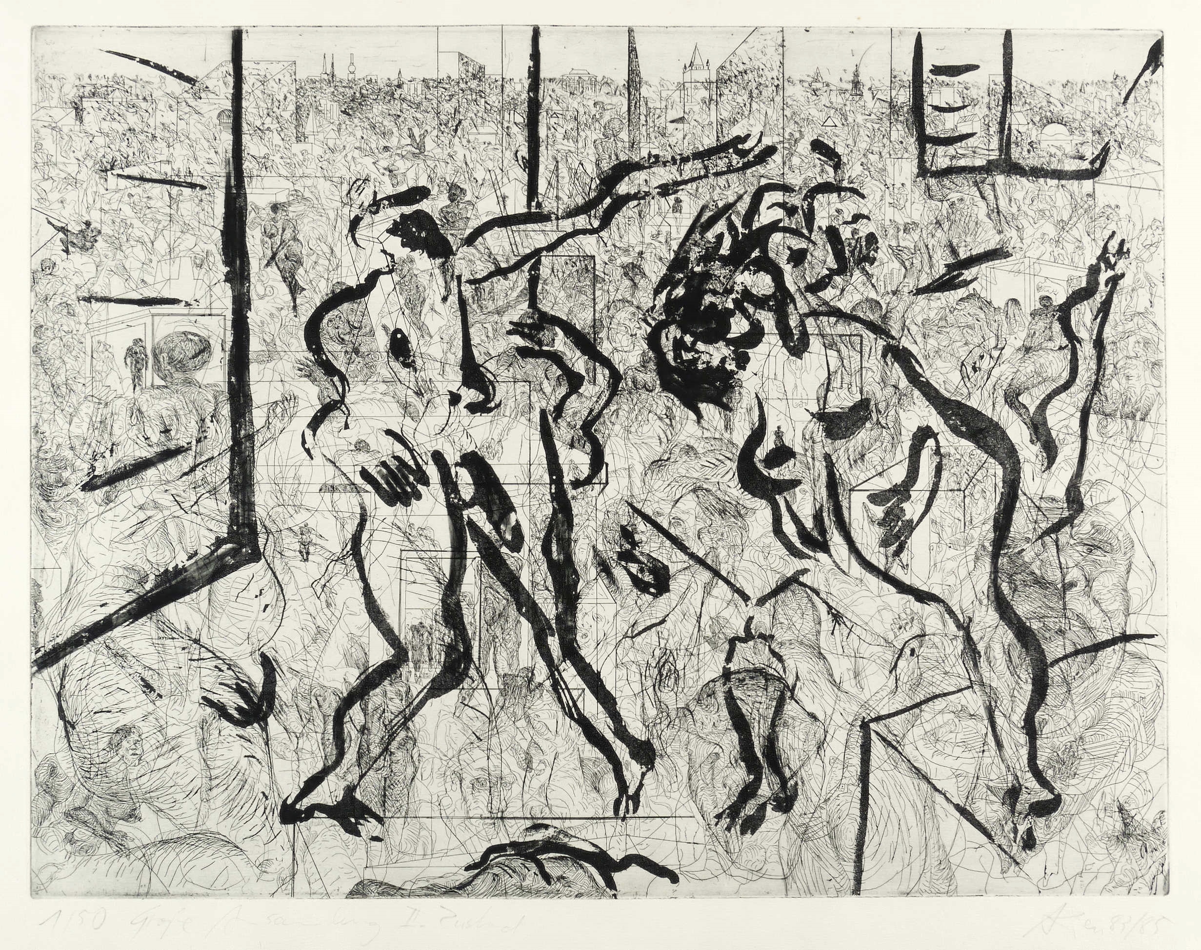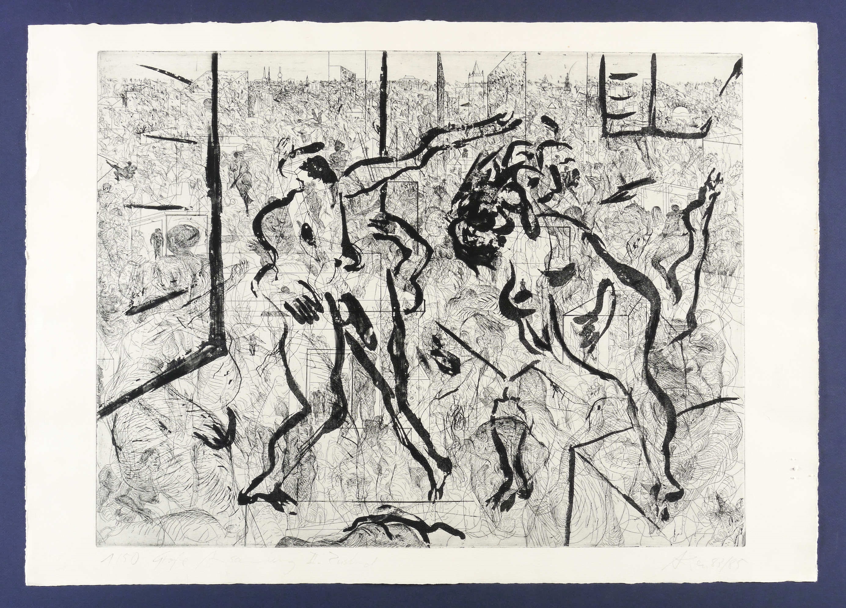 1983-1985. Radierung / Strichätzung & Aquatinta, in Schwarz, mit Plattenton, auf hellgelbem Hahnemühle-Bütten. – Originale Künstlergrafik, von Andreas Dress. – Auflage Exemplar Nr. 1/50. – 49,6 x 64,7 cm (Darstellung / Platte), 56 x 79 cm (Blatt).