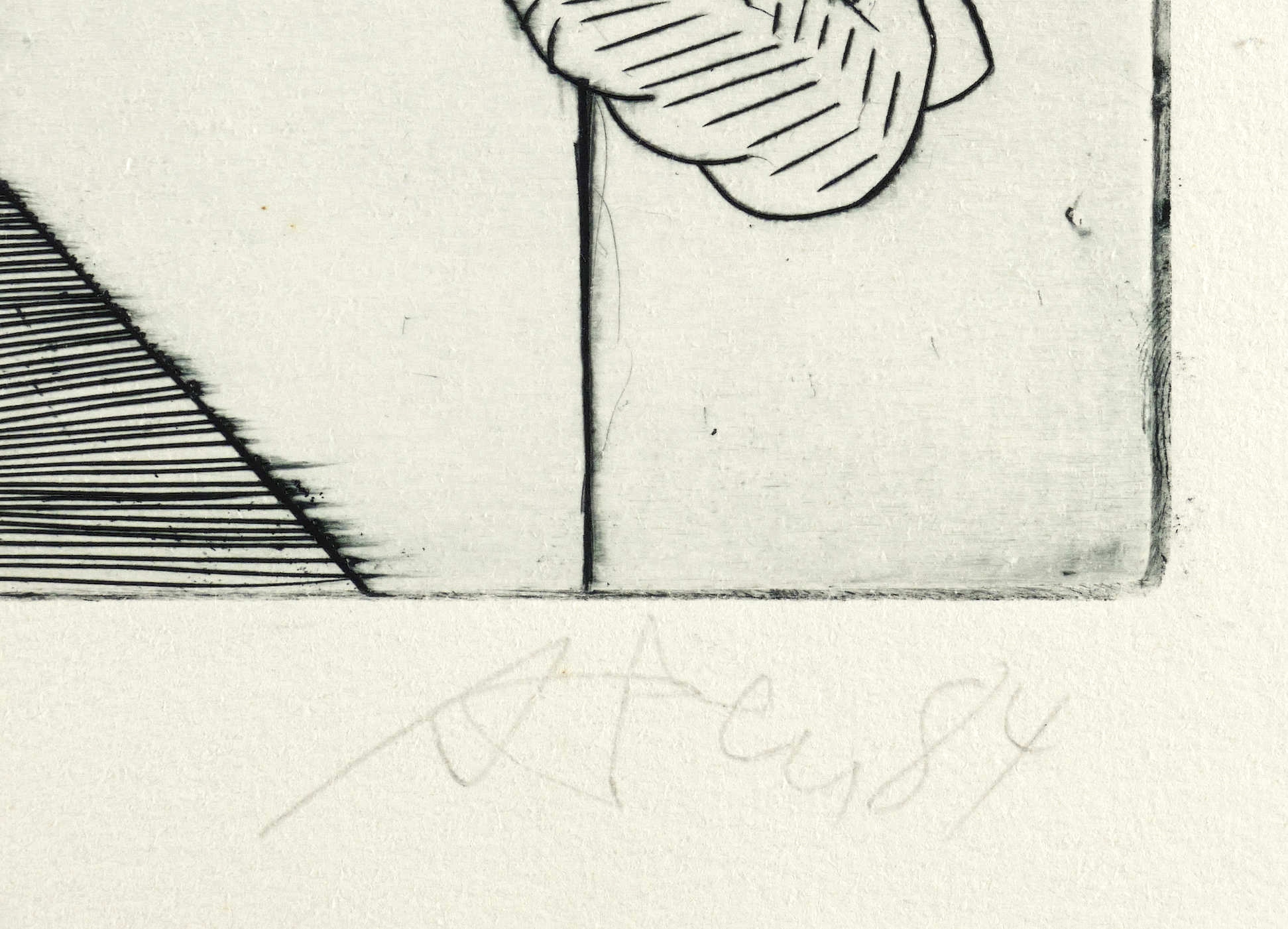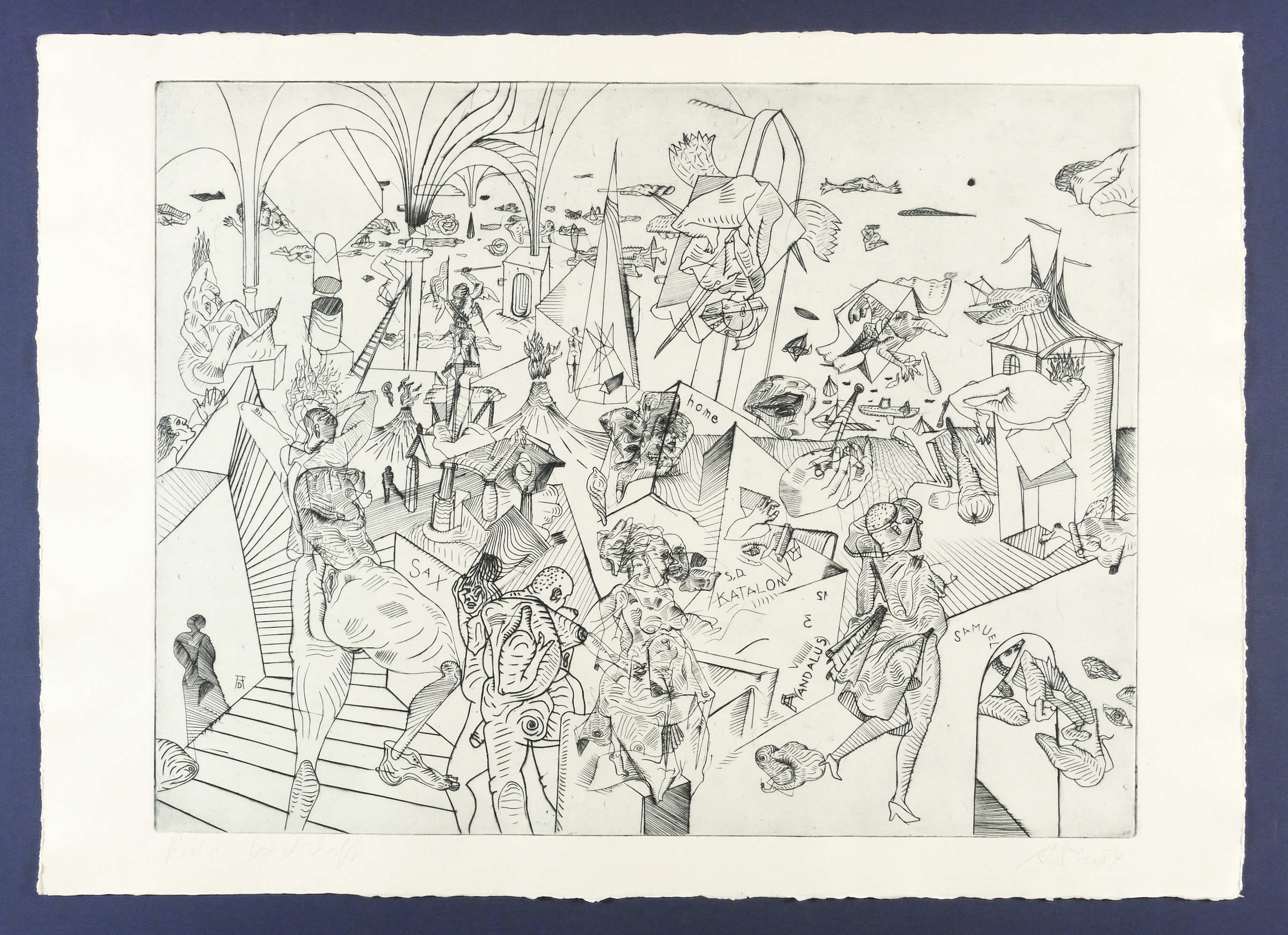 1984. Radierung / Kaltnadel, in Schwarz, mit Plattenton, auf hellgelbem Hahnemühle-Bütten. – Originale Künstlergrafik, von Andreas Dress. – Probedruck. – 49,3 x 64,5 cm (Darstellung / Platte), 57 x 79 cm (Blatt).
