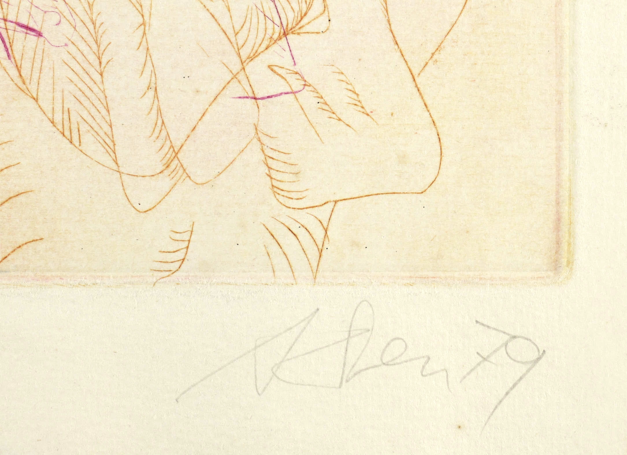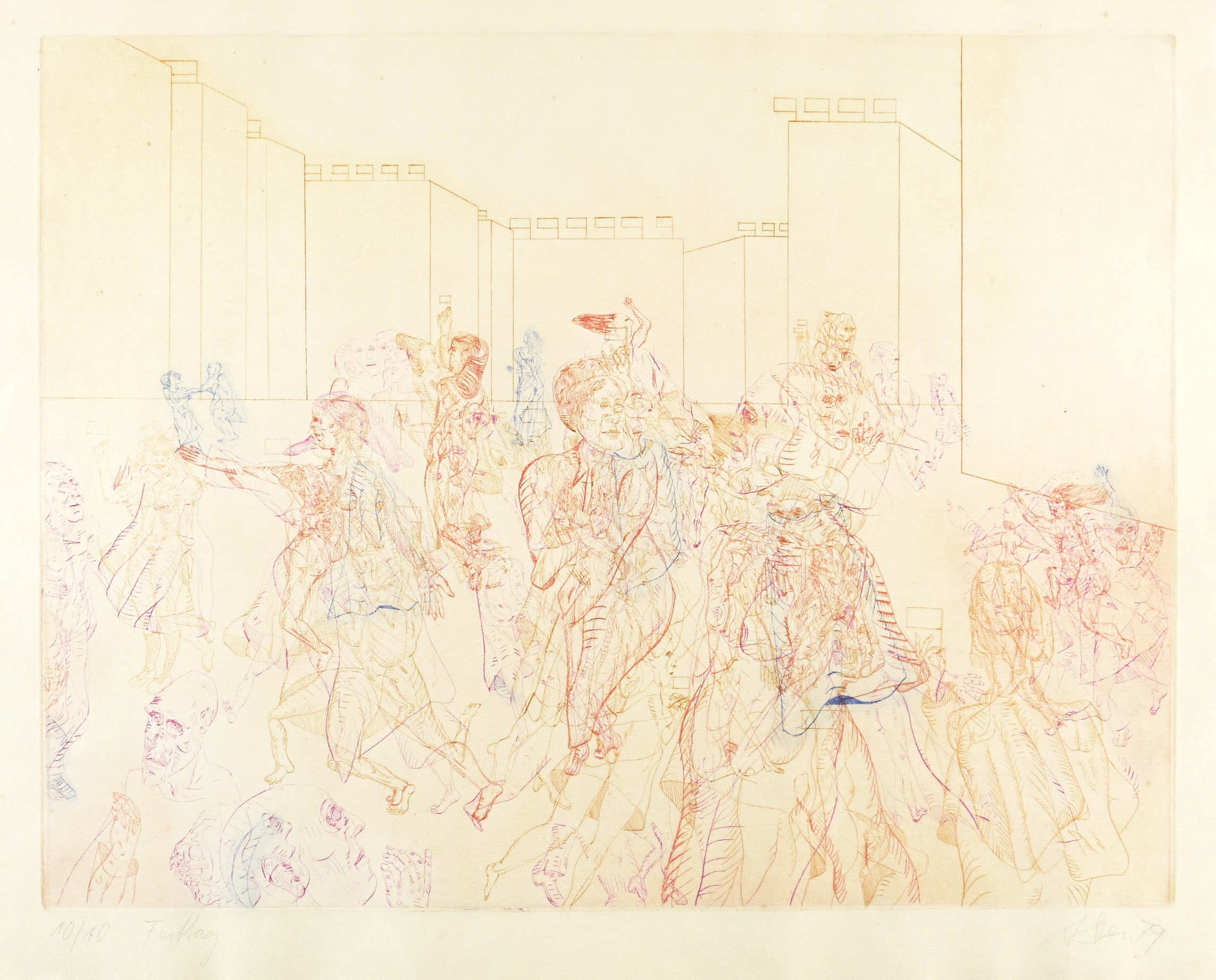 1979. Farbradierung / Strichätzung, in Orange, Rot & Blau, auf gelblichem Karton. – Originale Künstlergrafik, von Andreas Dress. – Auflage Exemplar Nr. 10/10. – 49,5 x 64,4 cm (Darstellung / Platte), 59 x 76 cm (Blatt).