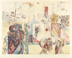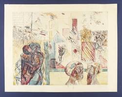1980. Farbradierung / Strichätzung, in Ocker, Rot, Blau & Schwarz, auf gelblichem Karton. – Originale Künstlergrafik, von Andreas Dress. – Probedruck. – 49,5 x 64,4 cm (Darstellung / Platte), 59 x 76 cm (Blatt).