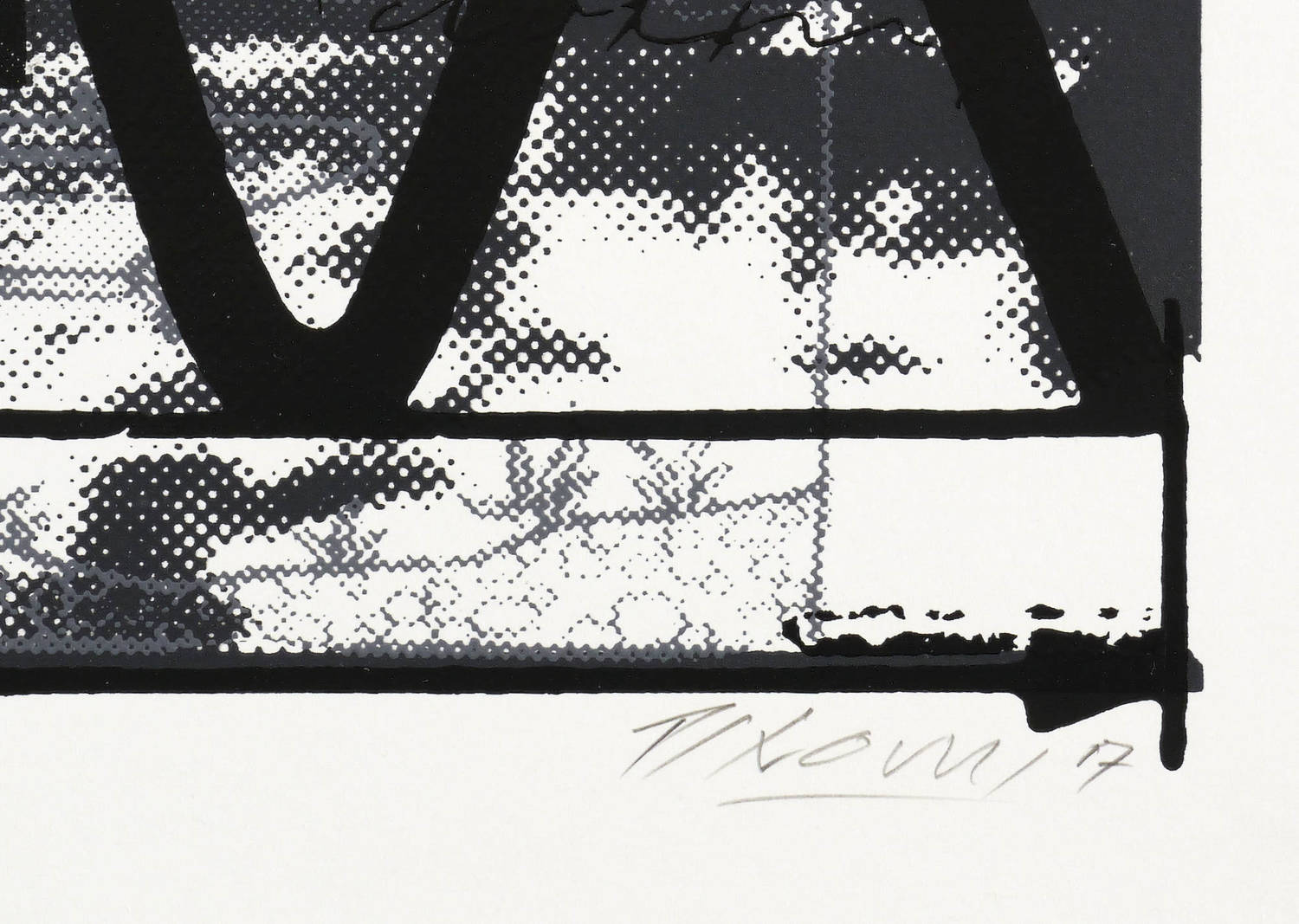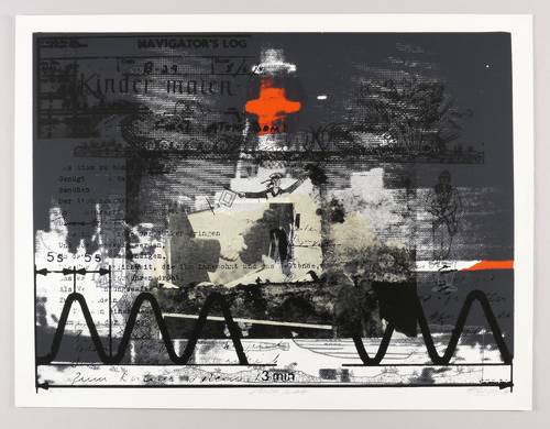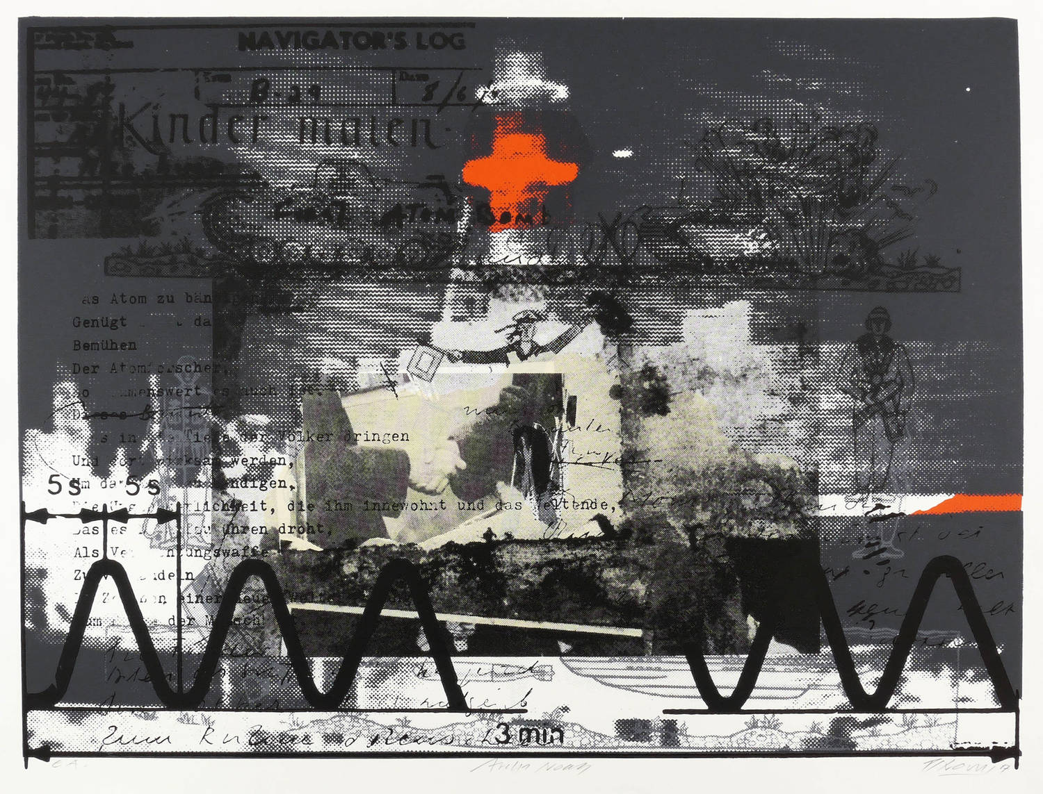 1987. Farbsiebdruck / Farbserigrafie, nach Fotomontage, in 4 Farben, auf starkem weißem Karton. – Originale Künstlergrafik, von Wolfgang Petrovsky. – Künstlerexemplar (e.a.). – 44,5 x 59,9 cm (Darstellung / Druckbild), 65 x 50 cm (Blatt).