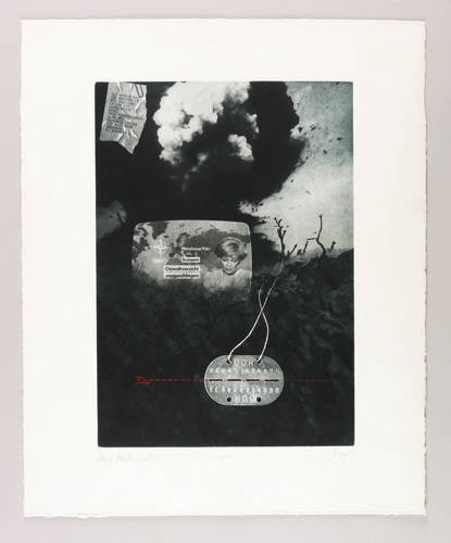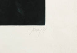 Rechts unten in Bleistift signiert und datiert: ″Jansong 84″. Links Titel: ″Meine Marke mit PKZ″. Mittig Auflagenbezeichnung: ″e.a.″ – Die dargestellte Marke ist eine Erkennungsmarke der Nationalen Volksarmee (NVA), die Soldaten in der DDR tragen mussten. Sie dient eigentlich der Identifizierung gefallener Soldaten. Darin eingestanzt die Personenkennzahl (PKZ), mittig die perforierte Sollbruchstelle. – Breiter Papierrand mit leichten Lagerspuren. Insgesamt guter Zustand.