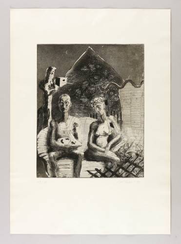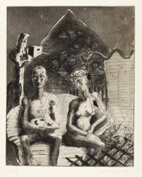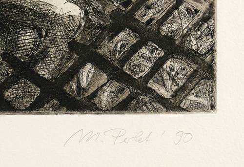 1990. Radierung / Aquatinta & Strichätzung, in Schwarz, auf genarbtem chamois Velinkarton. – Von Mathias Perlet. – Auflage Exemplar Nr. 19/60. – 41,5 x 33,4 cm (Darstellung / Platte), 70 x 50 cm (Blatt).
