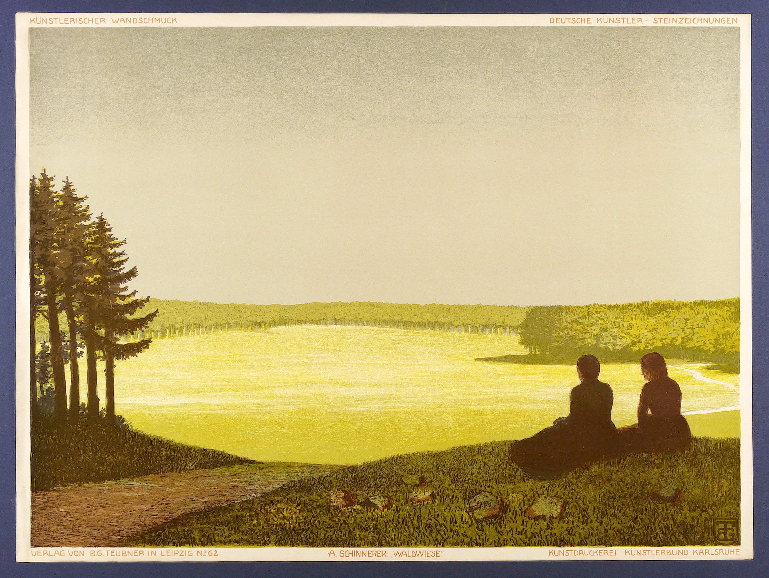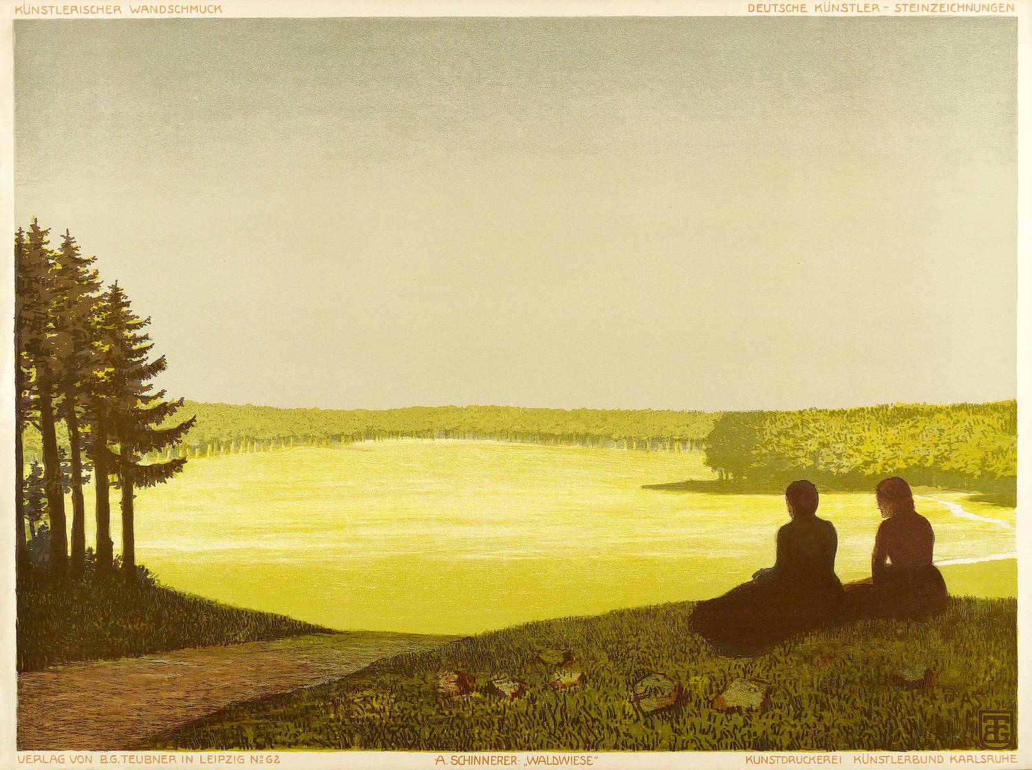 (Leipzig: B.G. Teubner 1903). – Nicht handsigniert. Im Stein rechts unten signiert und datiert: ″AS 1903.″ Darunter Wappenschild mit den Initialen des Verlegers. Im unteren Rand typografische Verlagsadresse. Mittig Bezeichnung: ″A. SCHINNERER: WALDWIESE″. Rechts Druckeradresse der Kunstdruckerei Künstlerbund Karlsruhe (KKK). – Der schmale Rand links wegen kleinen Rissen hinterlegt. Insgesamt gut erhalten.
