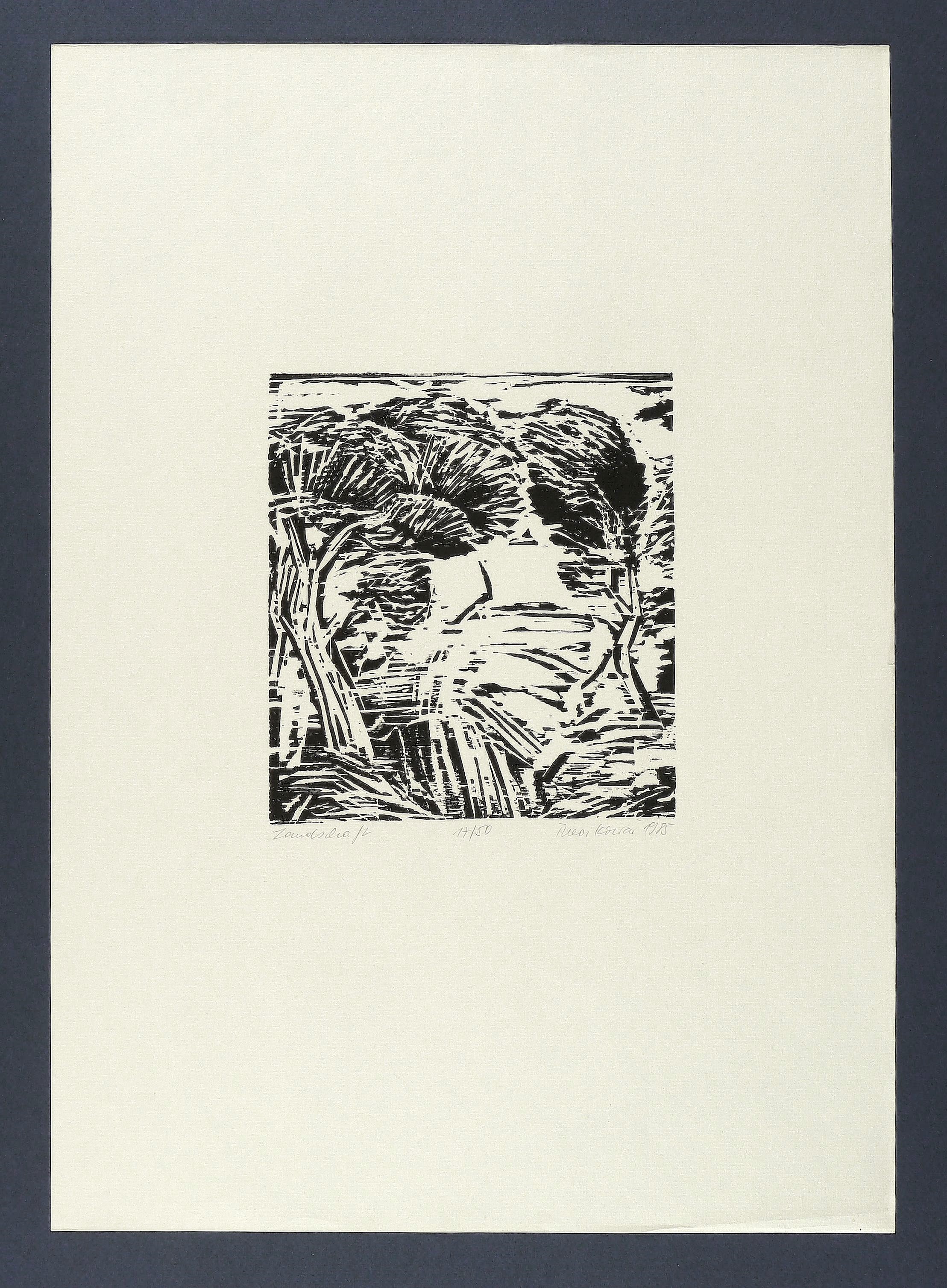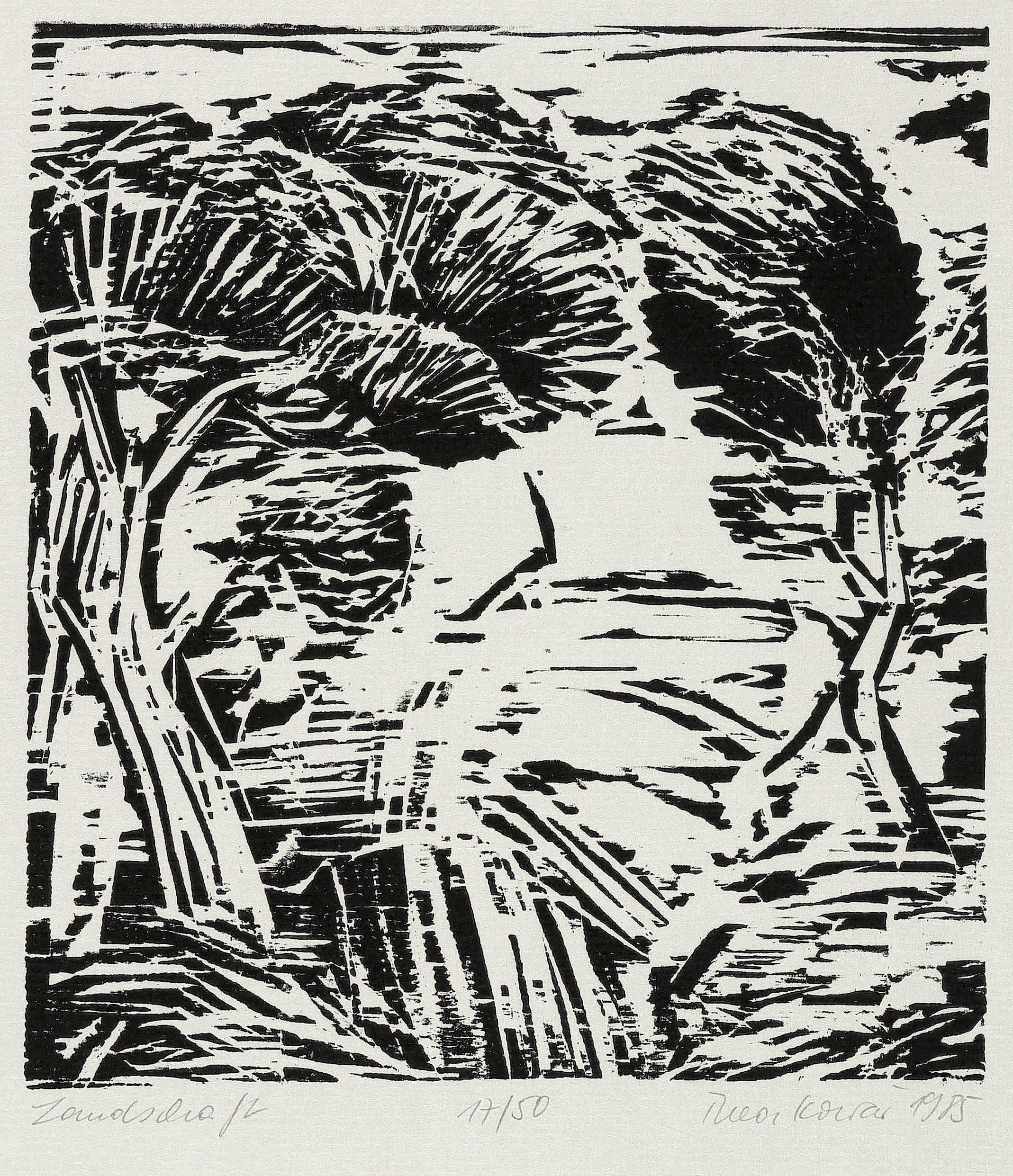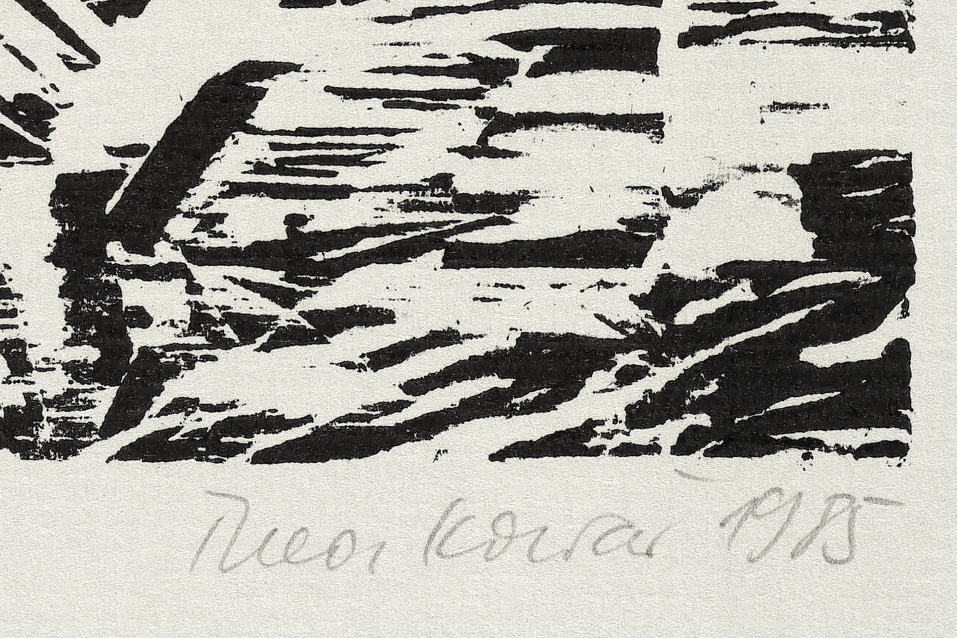 1985. Holzschnitt, in Schwarz, auf Maschinenbütten. – Originale Künstlergrafik, von Thea Kowar. – Auflage Exemplar Nr. 17/50. – 18,1 x 16,4 cm (Darstellung / Druckstock), 48 x 34 cm (Blatt).