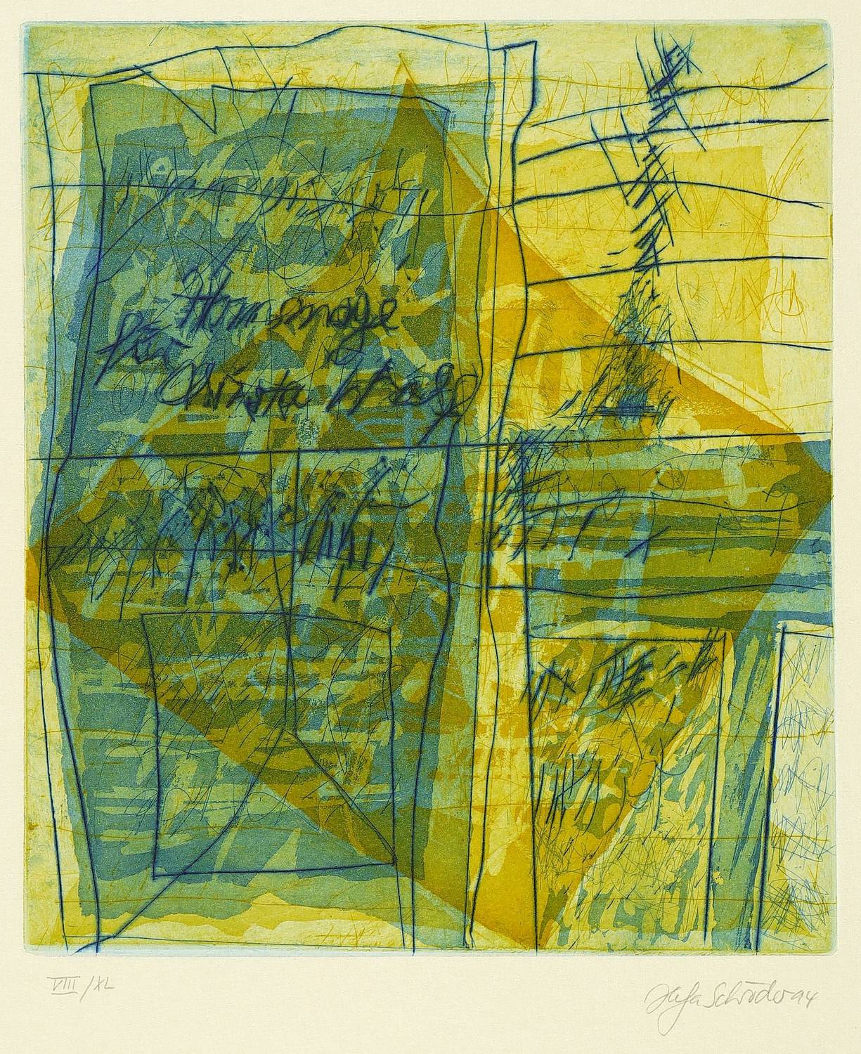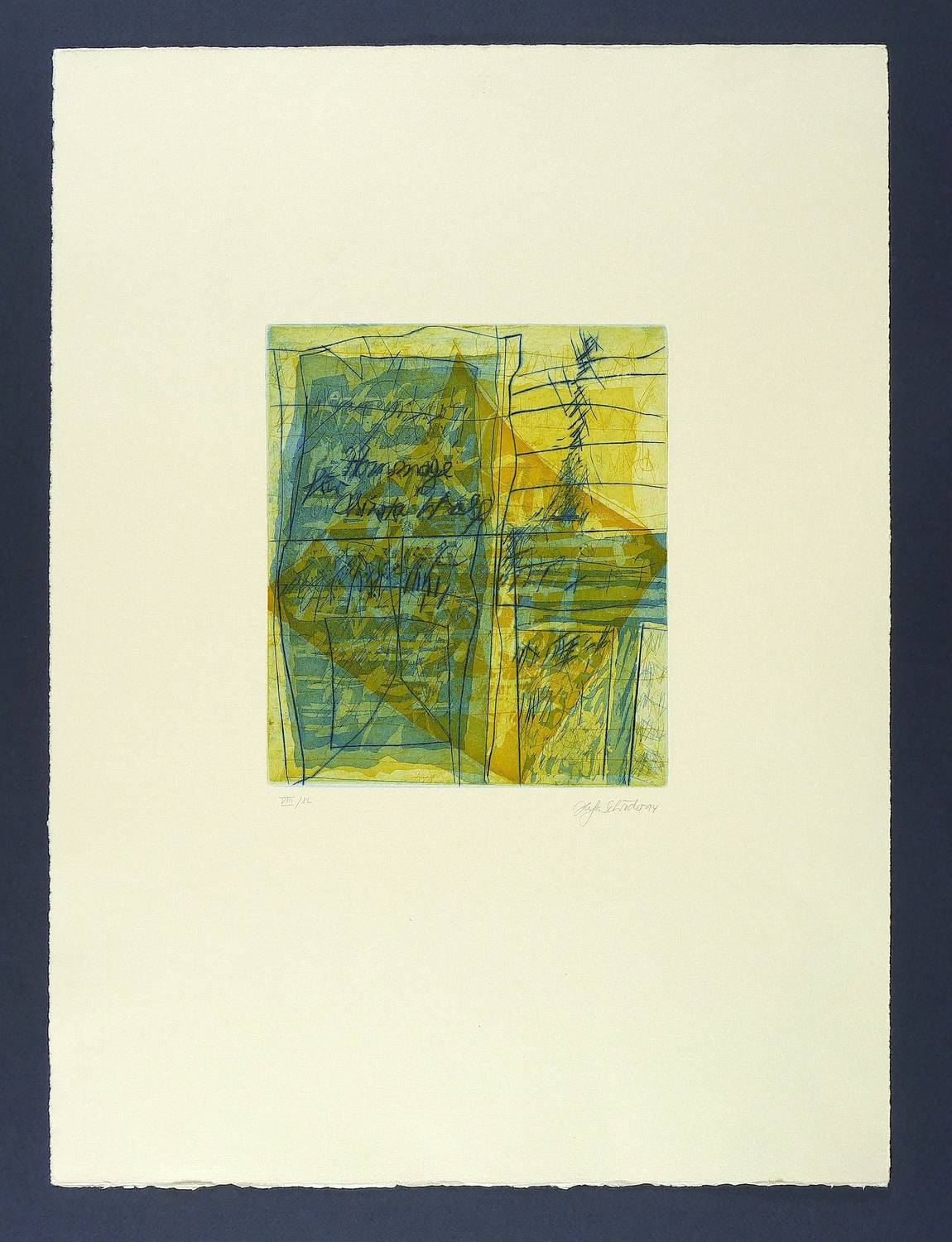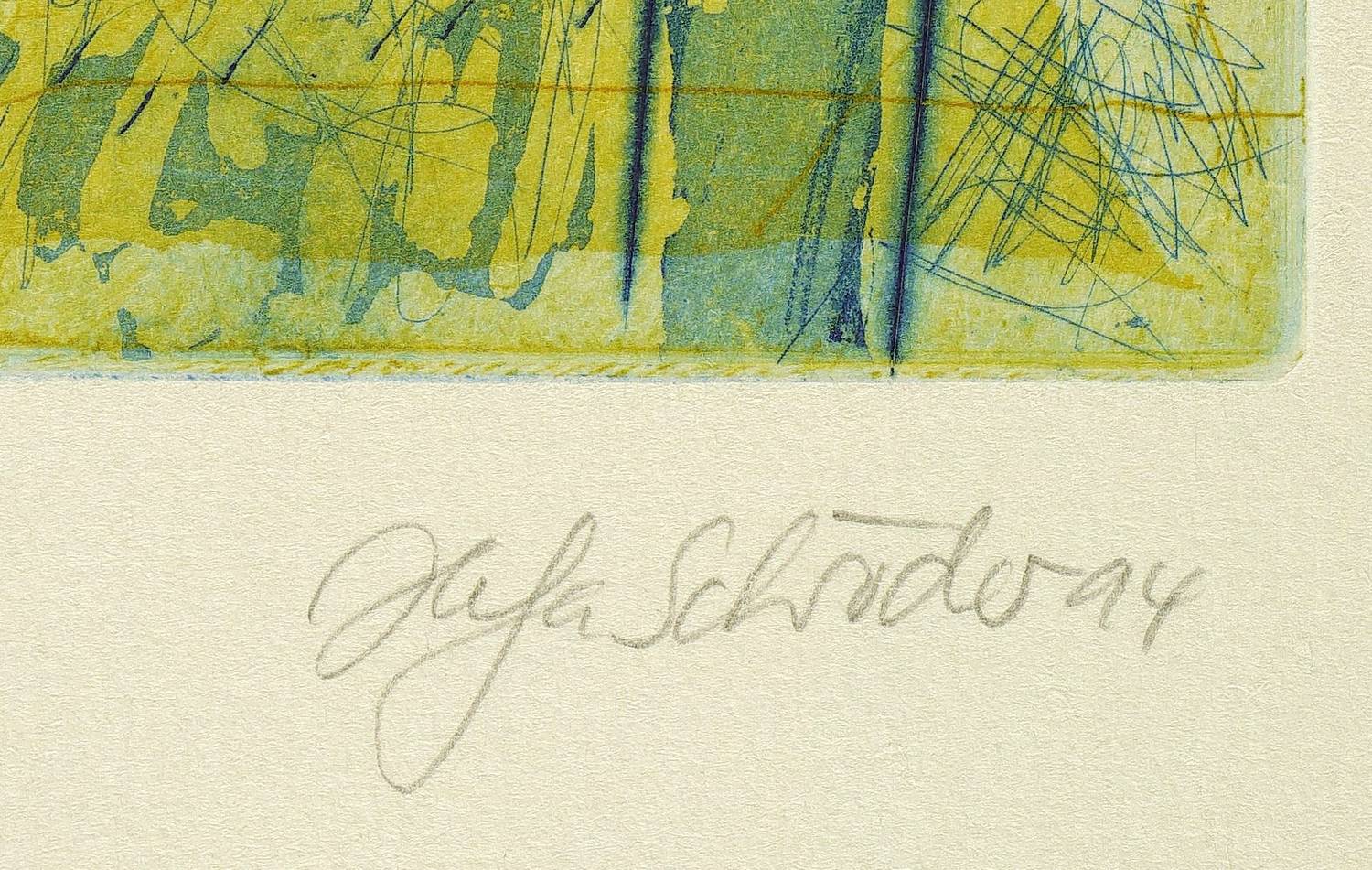 1994. Farbradierung / Aquatinta & Strichätzung, in 2 Farben, auf Hahnemühle-Bütten. – Originale Künstlergrafik, von Helga Schröder. – Auflage Exemplar Nr. 8/40. – 21,8 x 18,9 cm (Darstellung / Platte), 54 x 40 cm (Blatt).