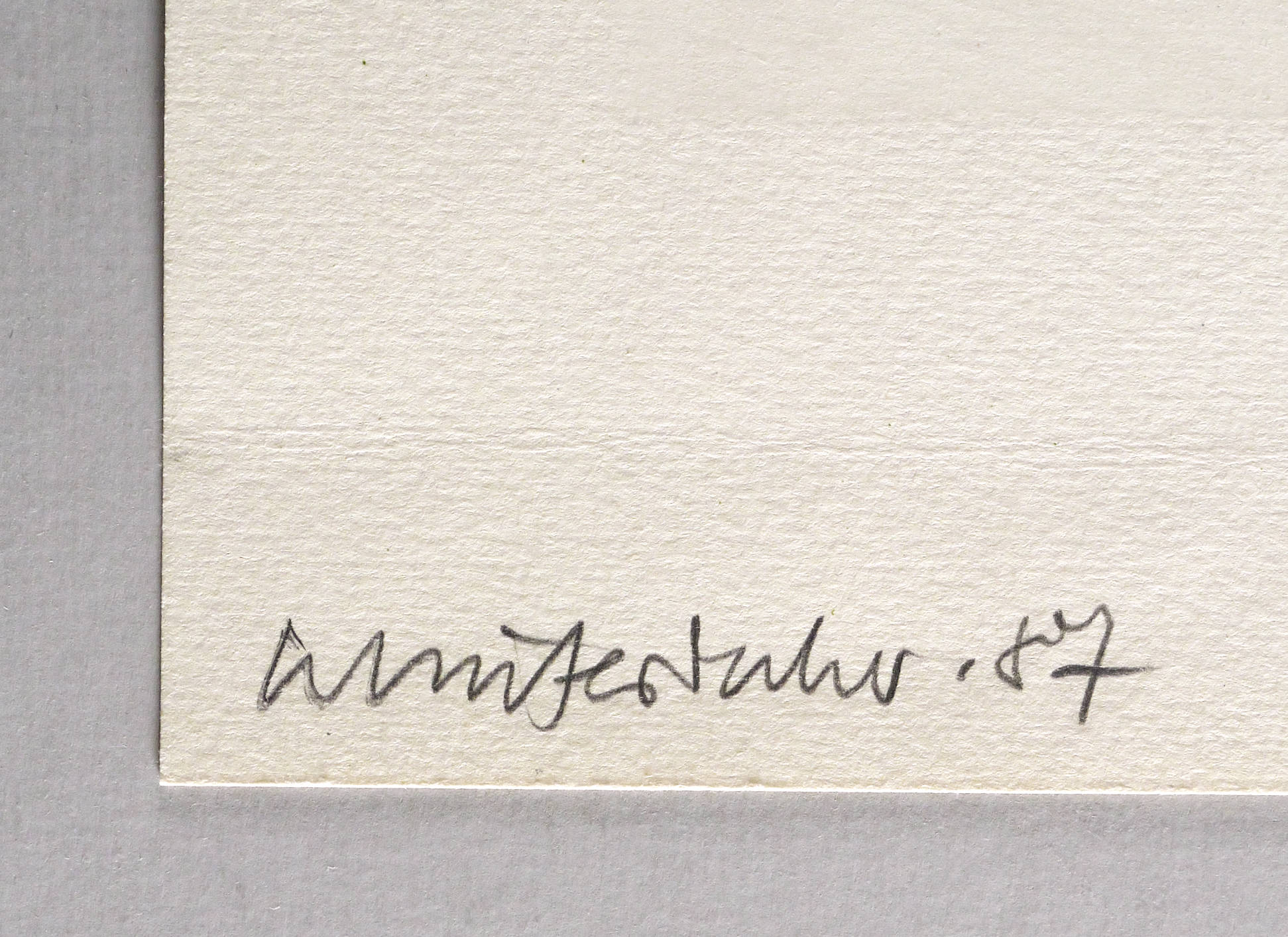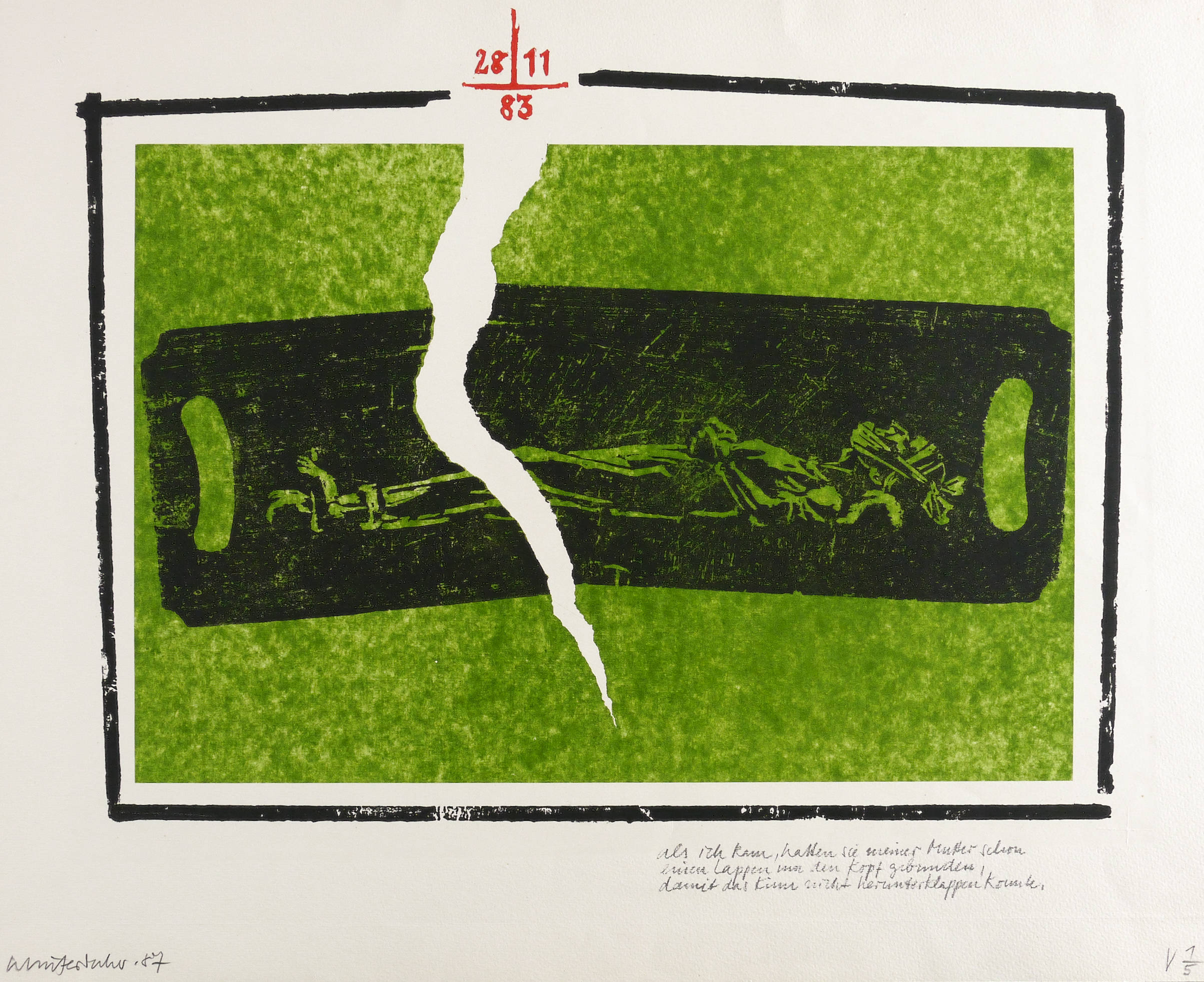 Schieferdecker-Haßler-Schobbert III 89. – Links unten in Bleistift signiert und datiert: ″Schieferdecker 87″. Rechts am Rand Auflagenbezeichnung: ″V 1/5″. Im Druck oben bezeichnet: ″28 / 11 / 83″. Rechts unten weiter: ″als ich kam, hatten sie meiner Mutter schon / einen Lappen um den Kopf gebunden, / damit das Kinn nicht herunterklappen konnte.″ – Im unteren Rand, dicht unterhalb der Schrift horizontaler Falz, geglättet. Sonst ohne Mangel. Insgesamt mäßig guter bis guter Zustand.