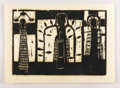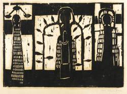 2003. Holzschnitt, in Schwarz, auf gelblichem Packpapier. – Von Klaus Hack. – 30,0 x 42,8 cm (Darstellung / Blatt), 37 x 50 cm (Trägerblatt).