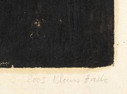 Rechts unten in Bleistift signiert und datiert: "2003 Klaus Hack". Das als Makulatur verwendete Papier verso mit zweifarbigem Packpapier-Druck: "Warenhaus Marzahner Tor". – Die Komposition in der Struktur eines Triptychon entspricht der Holzskulptur "Zopffigur-Altar" von 2013 im geöffneten Zustand (heute Besitz Kunstsammlung der Evang.-Lutherischen Landeskirche Bayern). – Originalrandig. Druckfarbe in den Randbereichen der Kontur etwas ausfettend. Sonst tadellos erhalten. Guter Zustand.