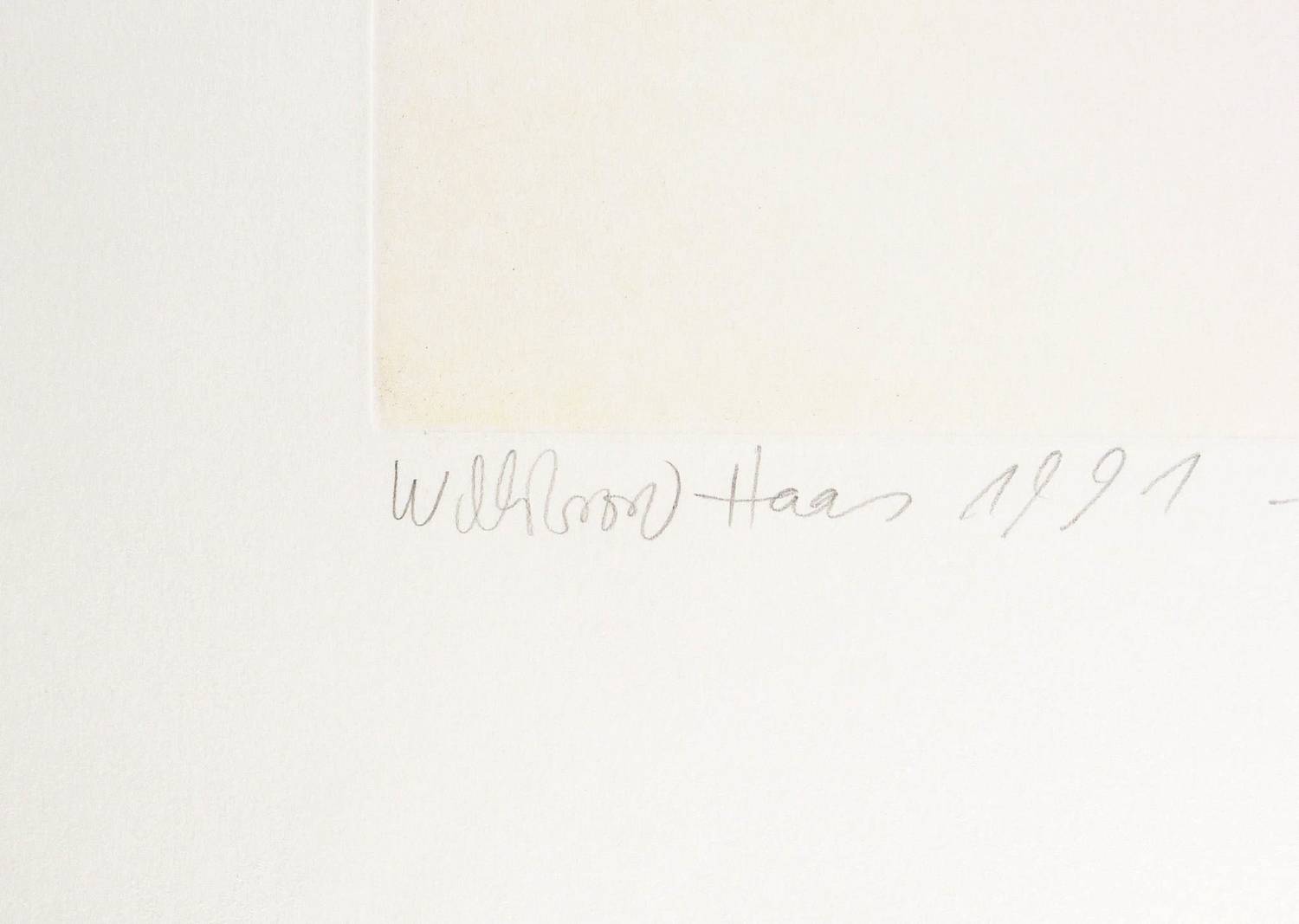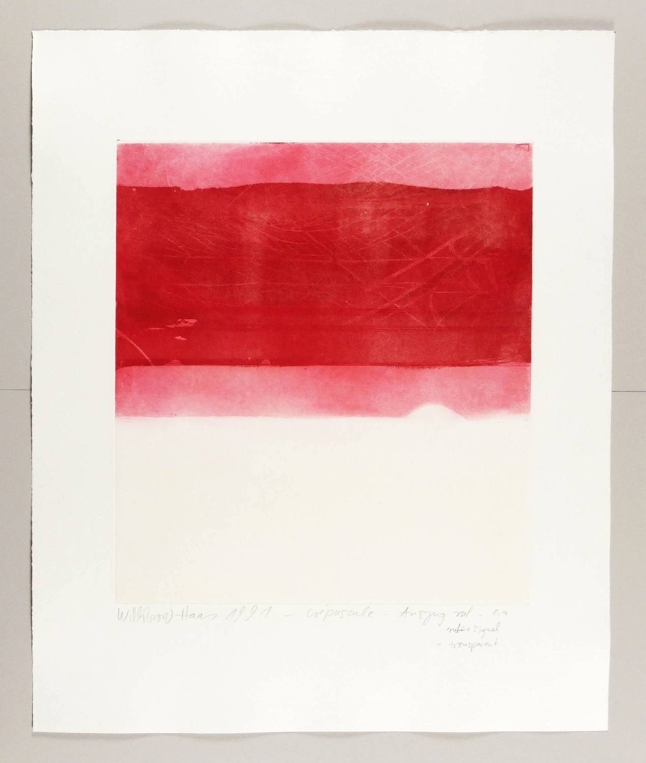 Links unten in Bleistift signiert und datiert: ″Willibrord Haas 1991″. Rechts Auflagenbezeichnung. Mittig Titel: ″crépuscule - Auszug rot - rubin + signal + transparent″. – Ohne Mängel. Tadellos erhalten.