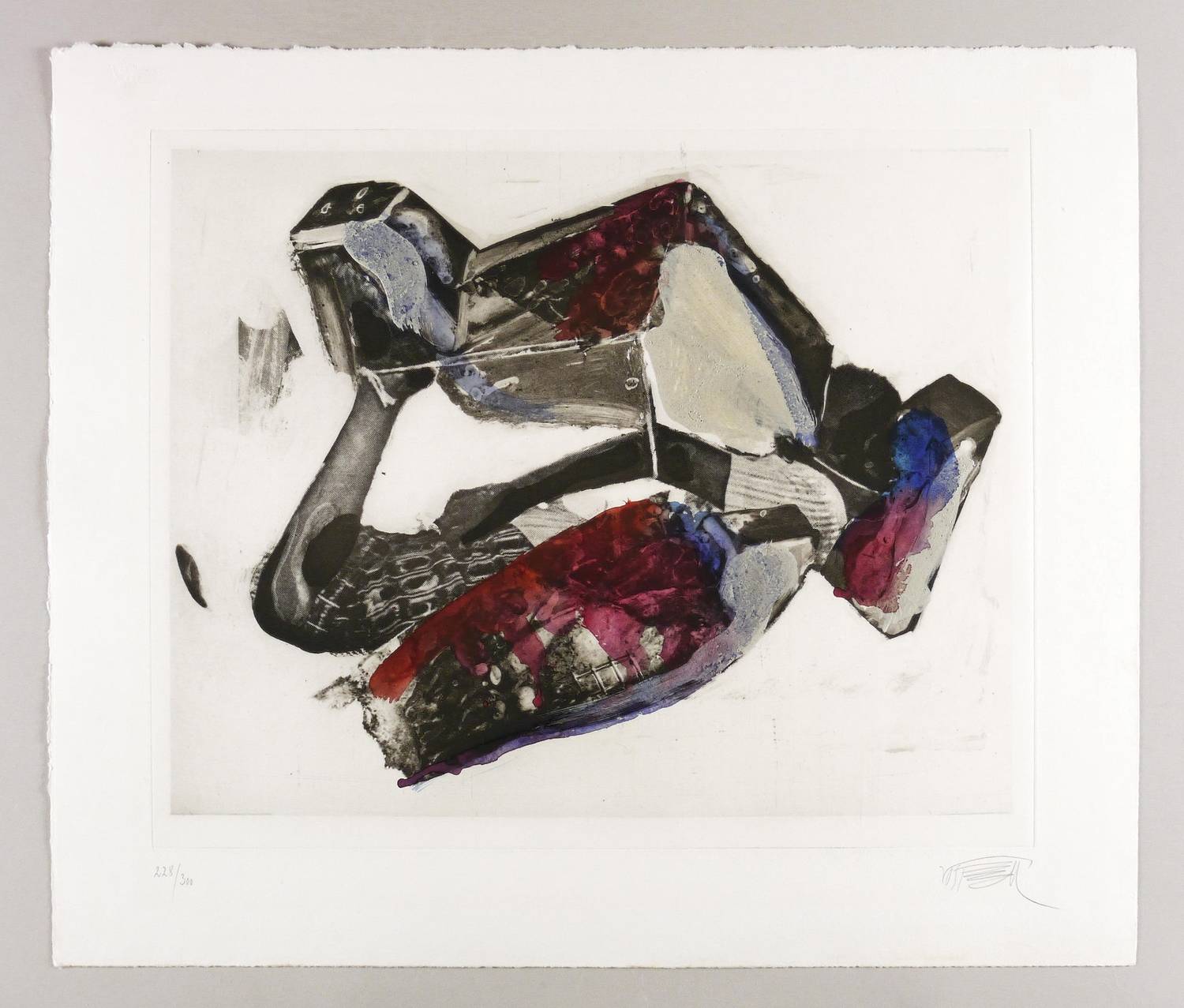 1987. Farbheliogravure / Farbheliogravüre, in 4 Farben, mit Sandgemisch, auf hellem Velin. – Originale Künstlergrafik, von Wolf Vostell. – Auflage Nr. 228/300 - überarbeitetes Unikat. – 42,1 x 51,4 cm (Platte), 54 x 64 cm (Blatt), 38,7 x 48,7 cm (Darstellung / Druckbild).