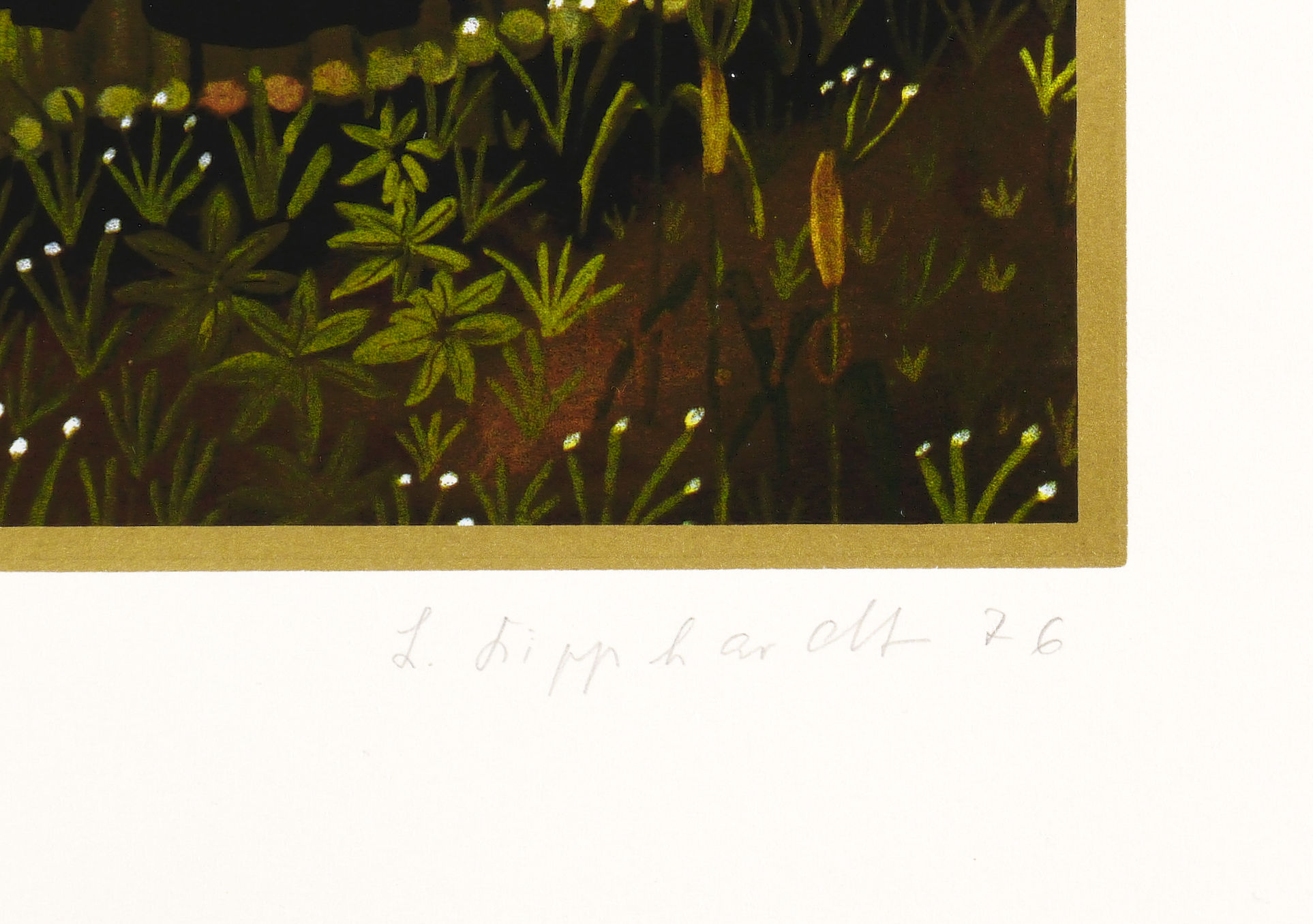 1976. Farblithografie, auf hellchamois Velin. – Originale Künstlergrafik, von Lore Kipphardt. – Auflage Exemplar Nr. 160/470. – 33,5 x 44,1 cm (Darstellung / Druckbild), 45 x 60 cm (Blatt).
