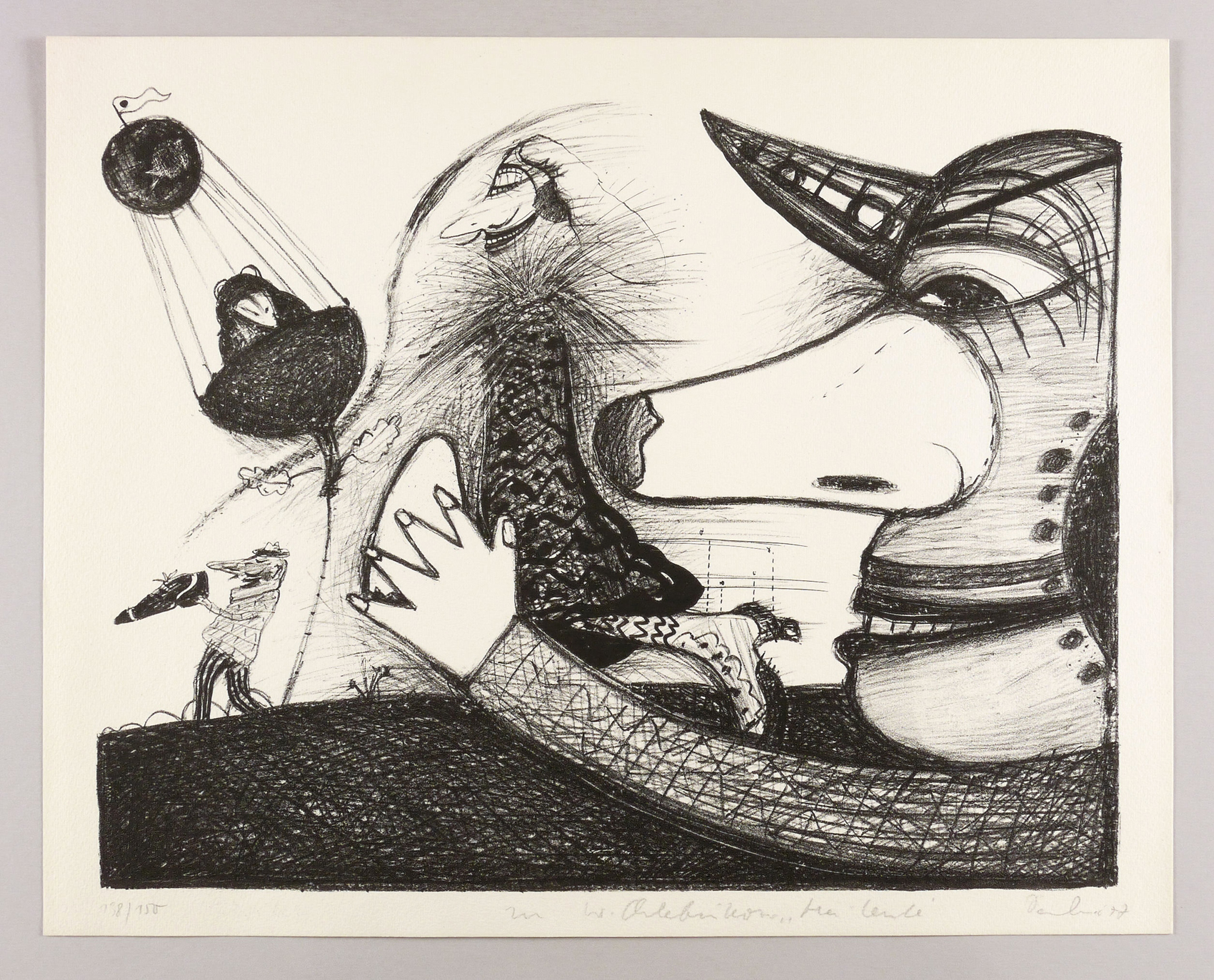 Rechts unten in Bleistift signiert und datiert: ″Dammbeck 77″. Links Auflagenbezeichnung: ″138/150″. Mittig Titel: ″zu W. Chlebnikow 'Ha Leute'″. – Sehr guter Zustand.