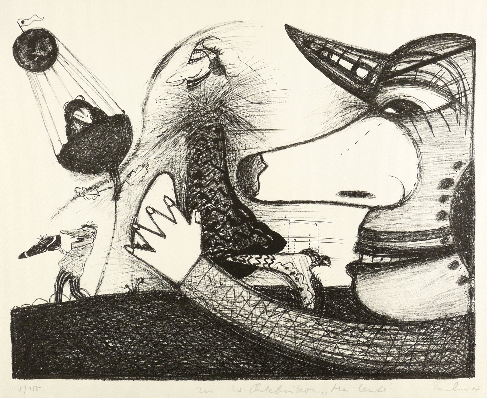 1977. Lithografie / Kreide- & Pinsellithografie, in Schwarz, auf genarbtem chamois Maschinenbütten. – Originale Künstlergrafik, von Lutz Dammbeck. – Auflage Exemplar Nr. 138/150. – 42,8 x 54,3 cm (Darstellung / Druckbild), 48 x 60 cm (Blatt).