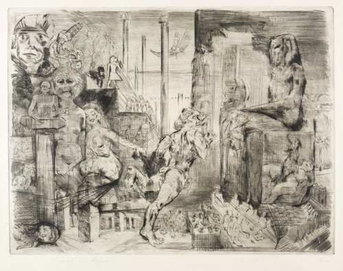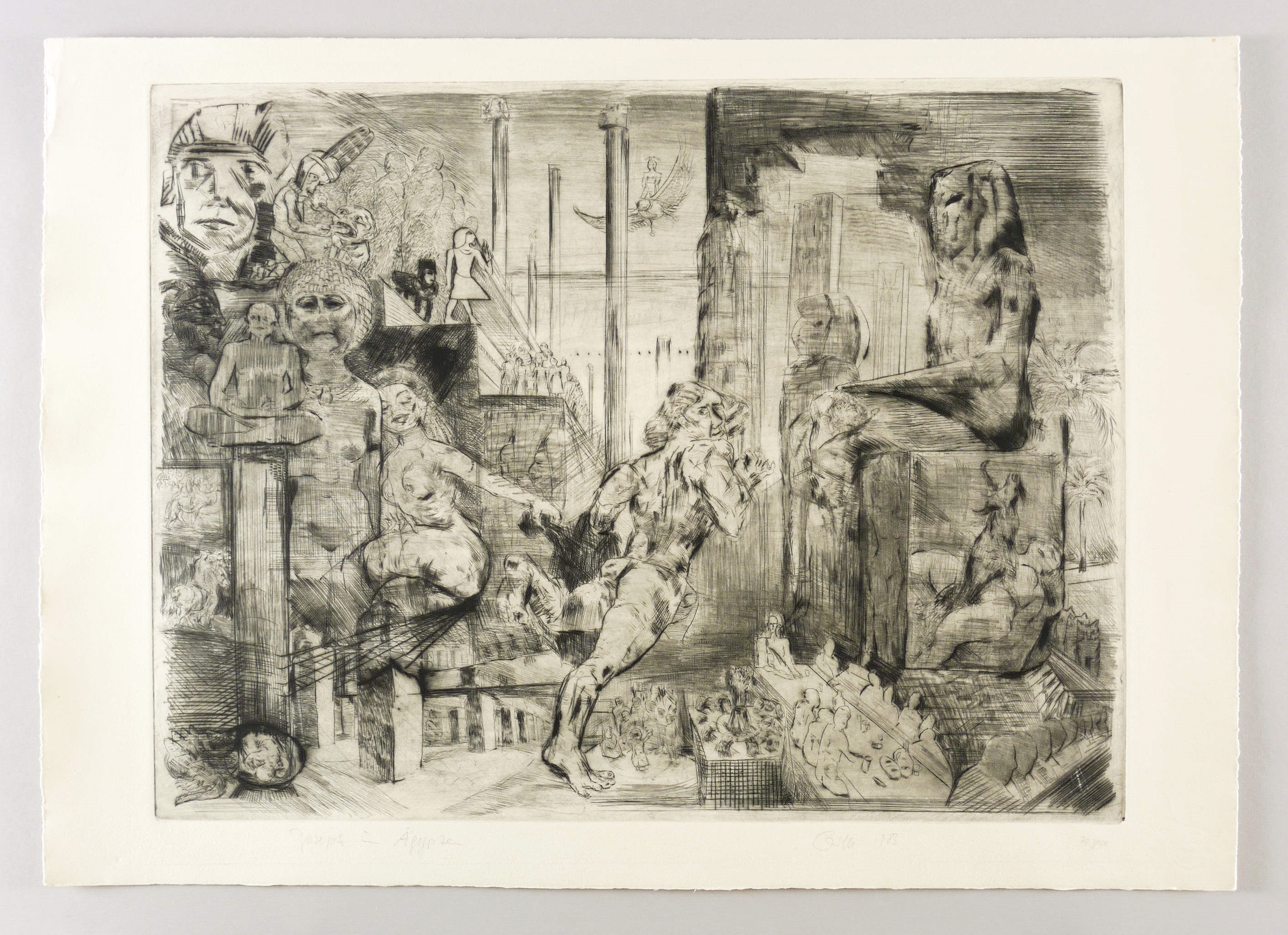 1983. Radierung / Kaltnadel & Roulette, mit Plattenton, in Schwarz, auf chamois Hahnemühle. – Originale Künstlergrafik, von Sighard Gille. – Auflage Exemplar Nr. 70/100. – 49,1 x 64,2 cm (Darstellung / Platte), 57 x 79 cm (Blatt).