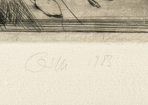Rechts unten in Bleistift signiert und datiert: ″Gille 1983″. Rechts daneben eigenhändige Auflagenbezeichnung: ″70/100″. Links Titel. Wasserzeichen. – Geringfügige Lagerspuren. Insgesamt sehr guter Zustand.