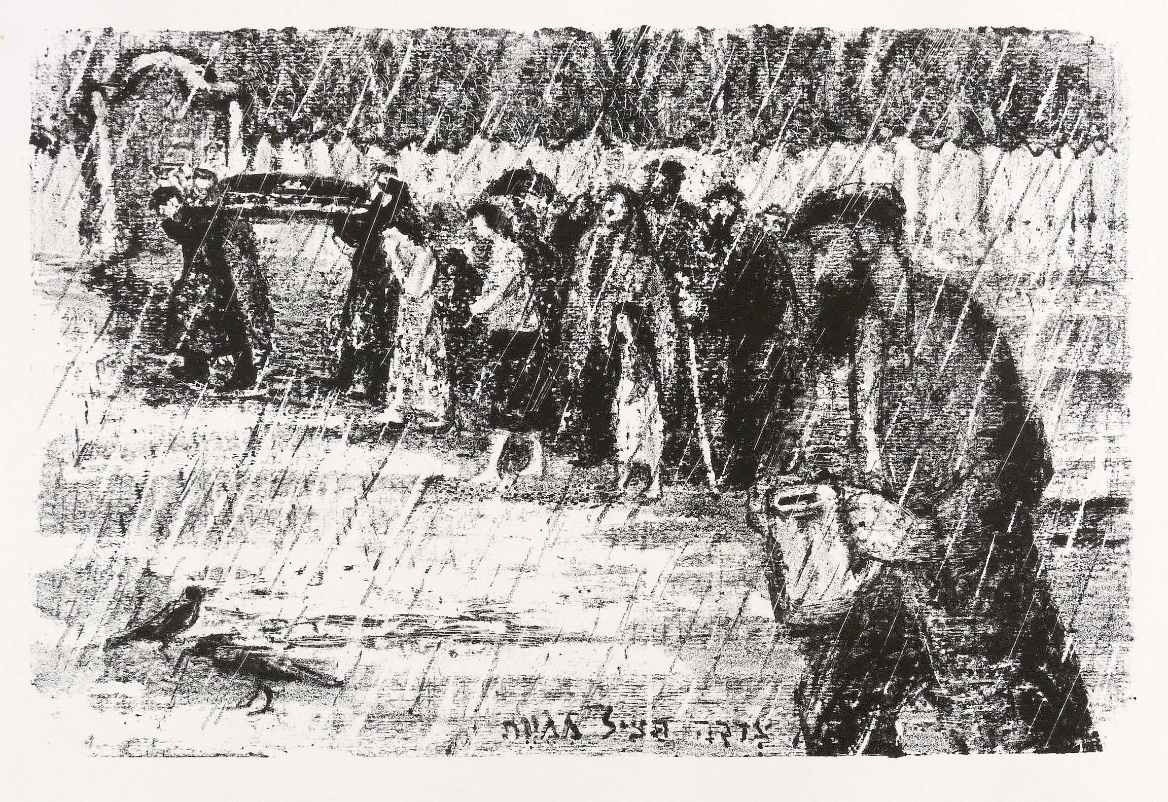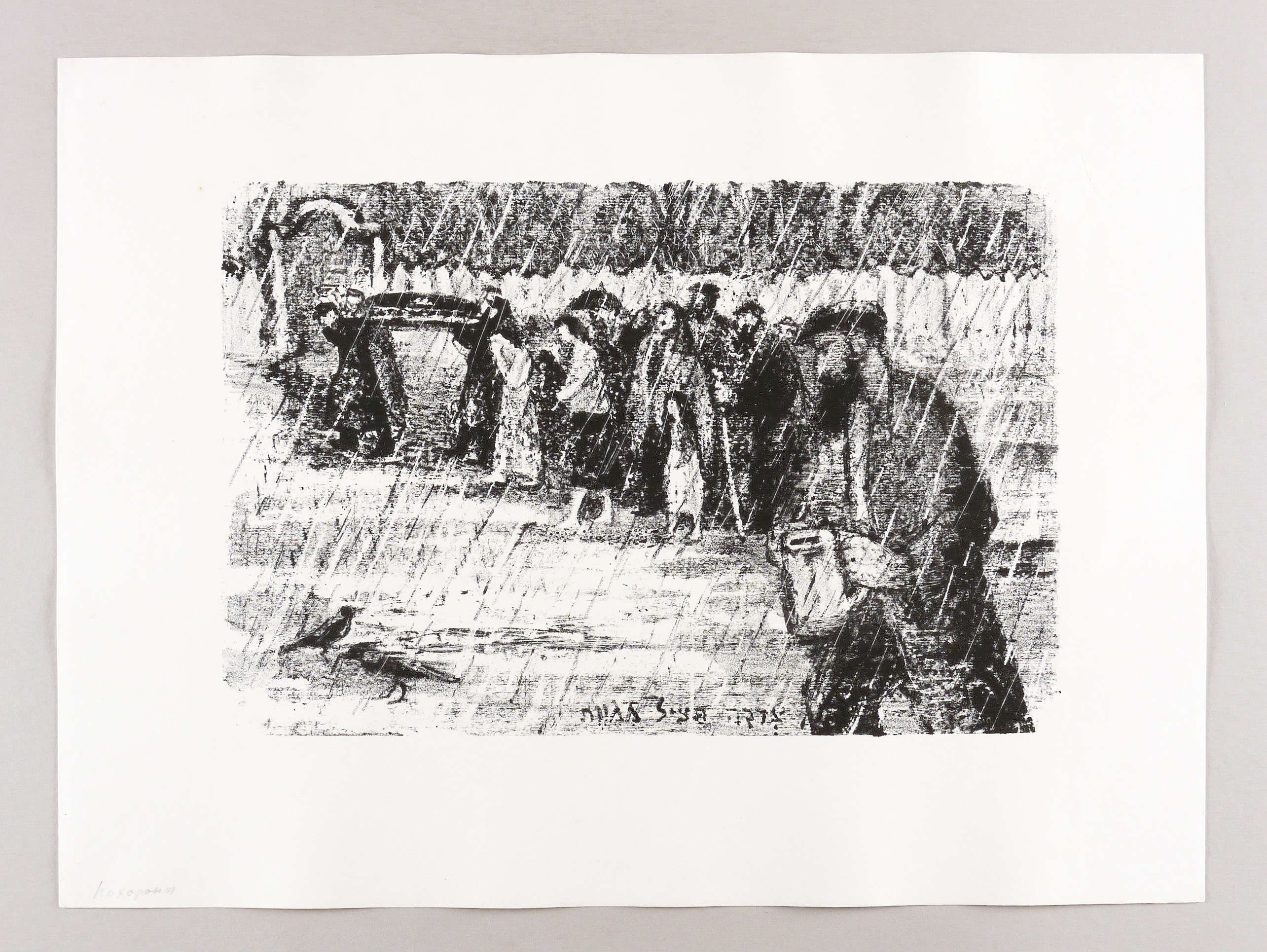 Mayer-Strodt V 71. – Unsigniert. Links unten in Bleistift vom Künstler kyrillisch bezeichnet: ″Похороны″. – Abzug außerhalb der Auflage von 125 Exemplaren zum lithografischen Mappenwerk ″Tewje, der Milchmann″ zu Scholem Alejchem (Moskau: Sovetskij Chudoznik 1961/1966). Druck wohl in Leningrad. - Die etwas spätere Edition als illustriertes Buch (Dresden: Verlag der Kunst 1967) wurde als ″Schönstes Buch der DDR 1967″ ausgezeichnet. - Der vermögende Lebemann Arontschik umwirbt Sprinze, die vierte Tochter Tewjes, wird jedoch von Mutter und Onkel von der nicht standesgemäßen Verbindung abgehalten, was zum Freitot der Sprinze führt. - Seltenes Blatt. – Sehr guter Zustand.