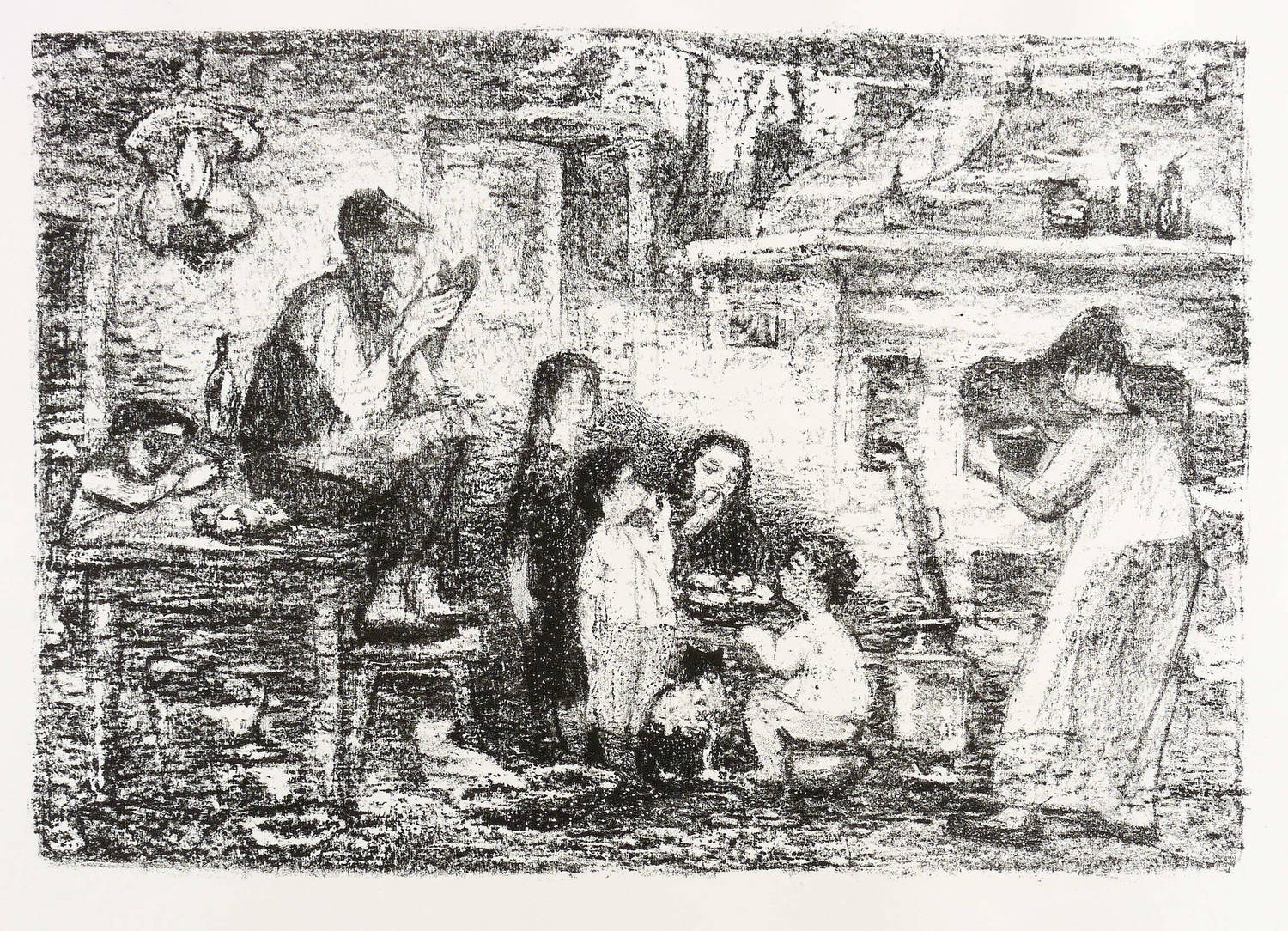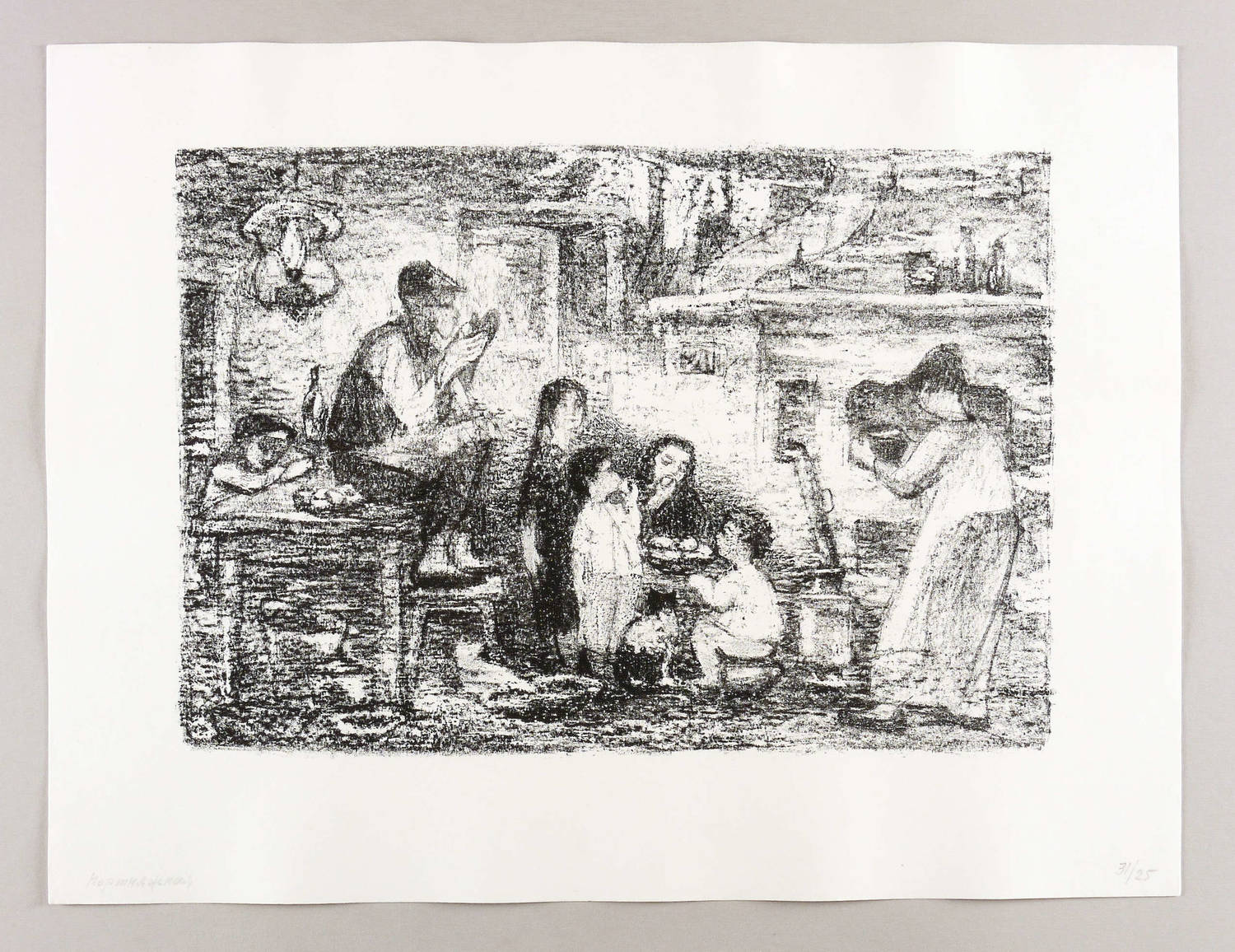 Mayer-Strodt V 27. – Unsigniert. Links unten in Bleistift vom Künstler kyrillisch bezeichnet: ″Портняжная″. Rechts unten nummeriert: ″31/25″. – Abzug außerhalb der Auflage von 125 Exemplaren zum lithografischen Mappenwerk ″Tewje, der Milchmann″ zu Scholem Alejchem (Moskau: Sovetskij Chudoznik 1961/1966). Druck wohl in Leningrad. - Die etwas spätere Edition als illustriertes Buch (Dresden: Verlag der Kunst 1967) wurde als ″Schönstes Buch der DDR 1967″ ausgezeichnet. - Abendbrot der Familie des Schneiders Motel Kamisol (Mottel Kamzoil). Motel heiratete Zeitel, die älteste Tochter von Tewje. - Seltenes Blatt. – Sehr guter Zustand.