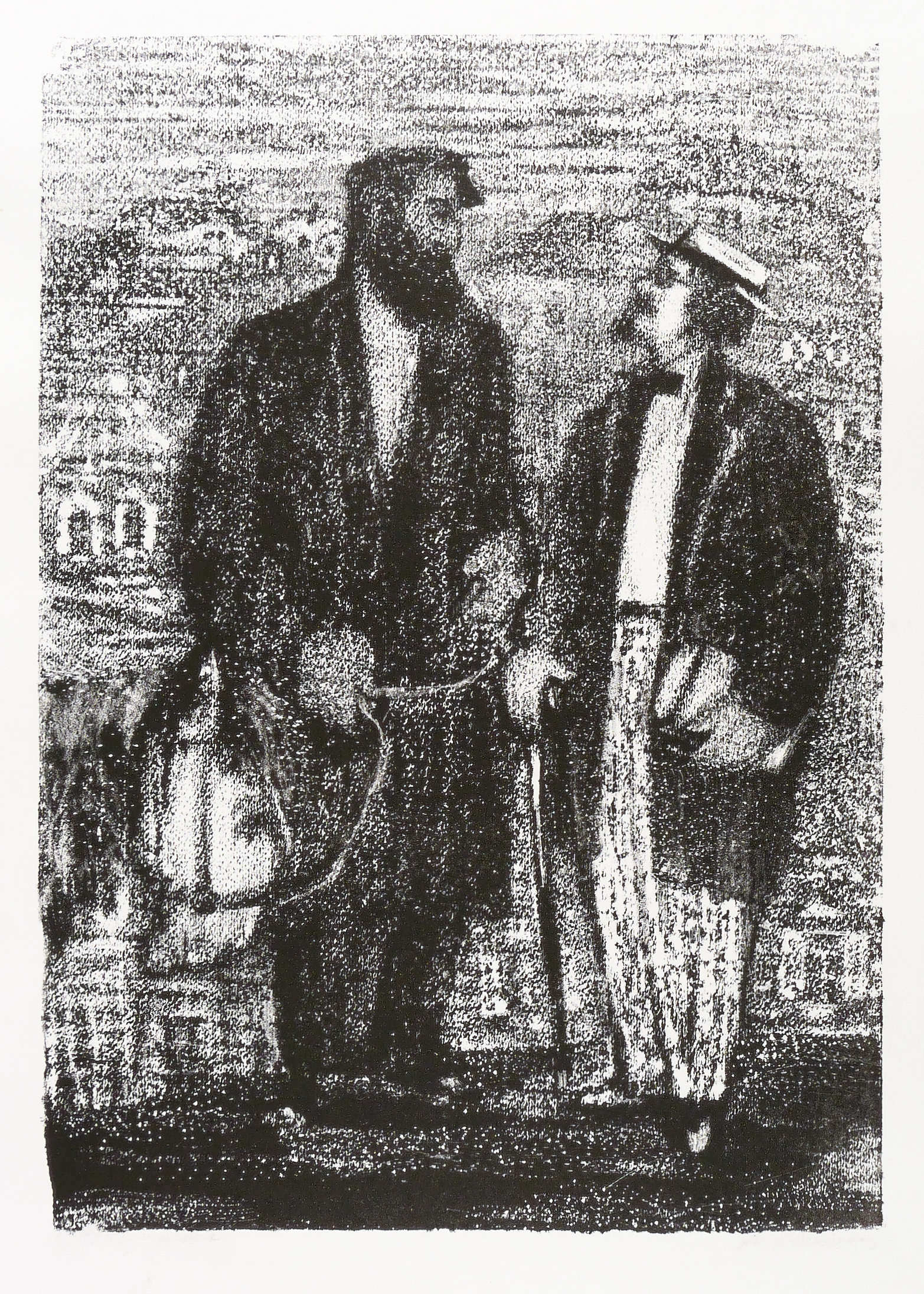 Mayer-Strodt V 30. – Rechts unten in Bleistift kyrillisch signiert: ″АКаплан″. Links Titel. In der linken unteren Blattecke kyrillisch bezeichnet: ″Фронтиeние. Тевье и сочинитель″. Rechts nummeriert: ″82/56″. – Signierter und autorisierter Abzug außerhalb der Auflage von 125 Exemplaren zum lithografischen Mappenwerk ″Tewje, der Milchmann″ zu Scholem Alejchem (Moskau: Sovetskij Chudoznik 1961/1966). Druck wohl in Leningrad. - Die etwas spätere Edition als illustriertes Buch (Dresden: Verlag der Kunst 1967) wurde als ″Schönstes Buch der DDR 1967″ ausgezeichnet. - Tewje erscheint mit seinem lahmen Gaul und dem Schriftsteller, dem Erzähler des Romans. Kaplan nutzt dies als ideales ganzfiguriges Porträt von Scholem Alejchem, im Habitus eines intellektuellen Sommerfrischlers. - Seltenes zentrales Blatt. – Bleistift-Signatur unvollständig gelöscht. Sonst tadellos. Mäßig guter Zustand.