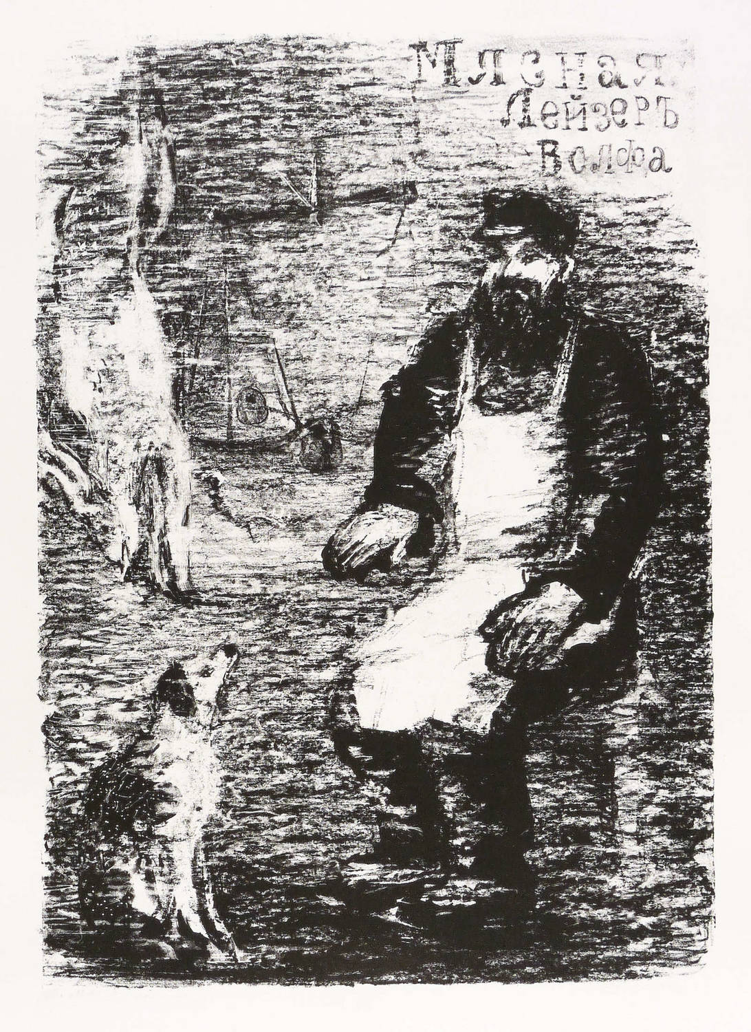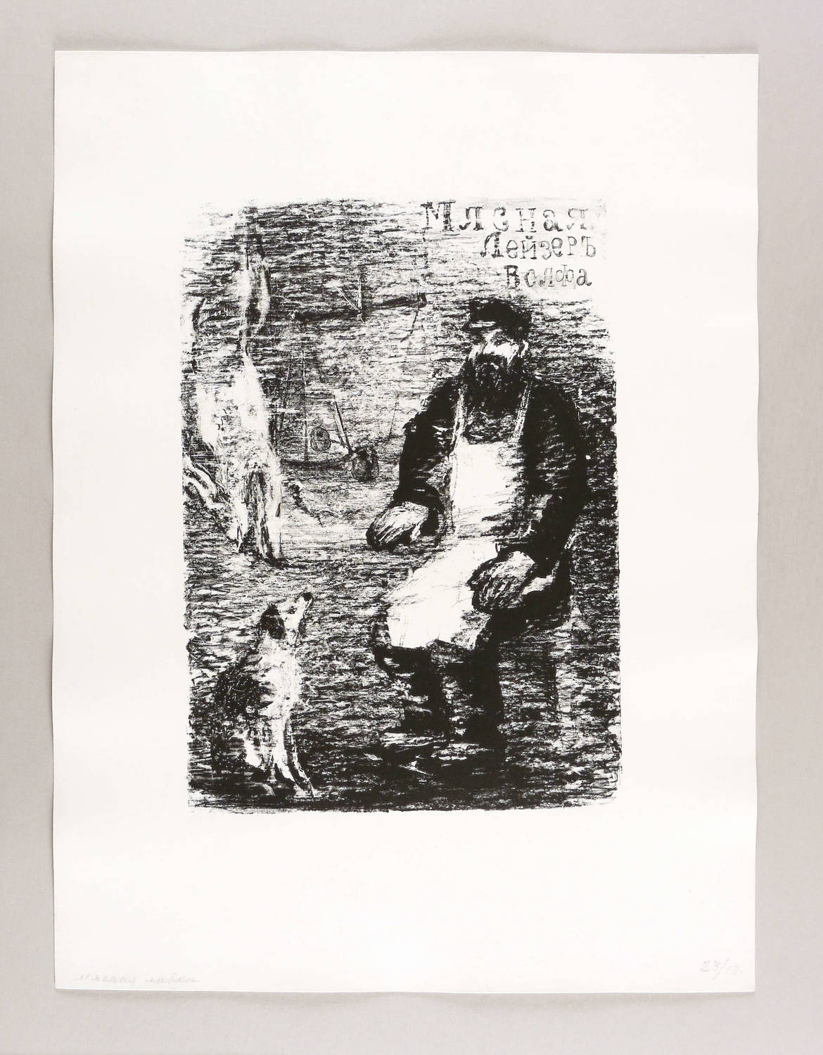Mayer-Strodt V 21. – Unsigniert. Links unten in Bleistift vom Künstler kyrillisch bezeichnet, etwa: ″Мяснaя чaвка″. Rechts gegenüber nummeriert: ″23/18″. Im Stein rechts oben Inschrift: ″Мяснaя Лейзeрь Волфа″. – Abzug außerhalb der Auflage von 125 Exemplaren zum lithografischen Mappenwerk ″Tewje, der Milchmann″ zu Scholem Alejchem (Moskau: Sovetskij Chudoznik 1961/1966). Druck wohl in Leningrad. - Die etwas spätere Edition als illustriertes Buch (Dresden: Verlag der Kunst 1967) wurde als ″Schönstes Buch der DDR 1967″ ausgezeichnet. - Der reiche verwitwete Metzger Lejser Wolf, hält um Zeitels Hand an. Zeitel, die älteste Tochter von Tewje, liebt aber den armen Schneidergesellen Motel Kamisol. - Seltenes Blatt. – Schönes Exemplar. Sehr guter Zustand.