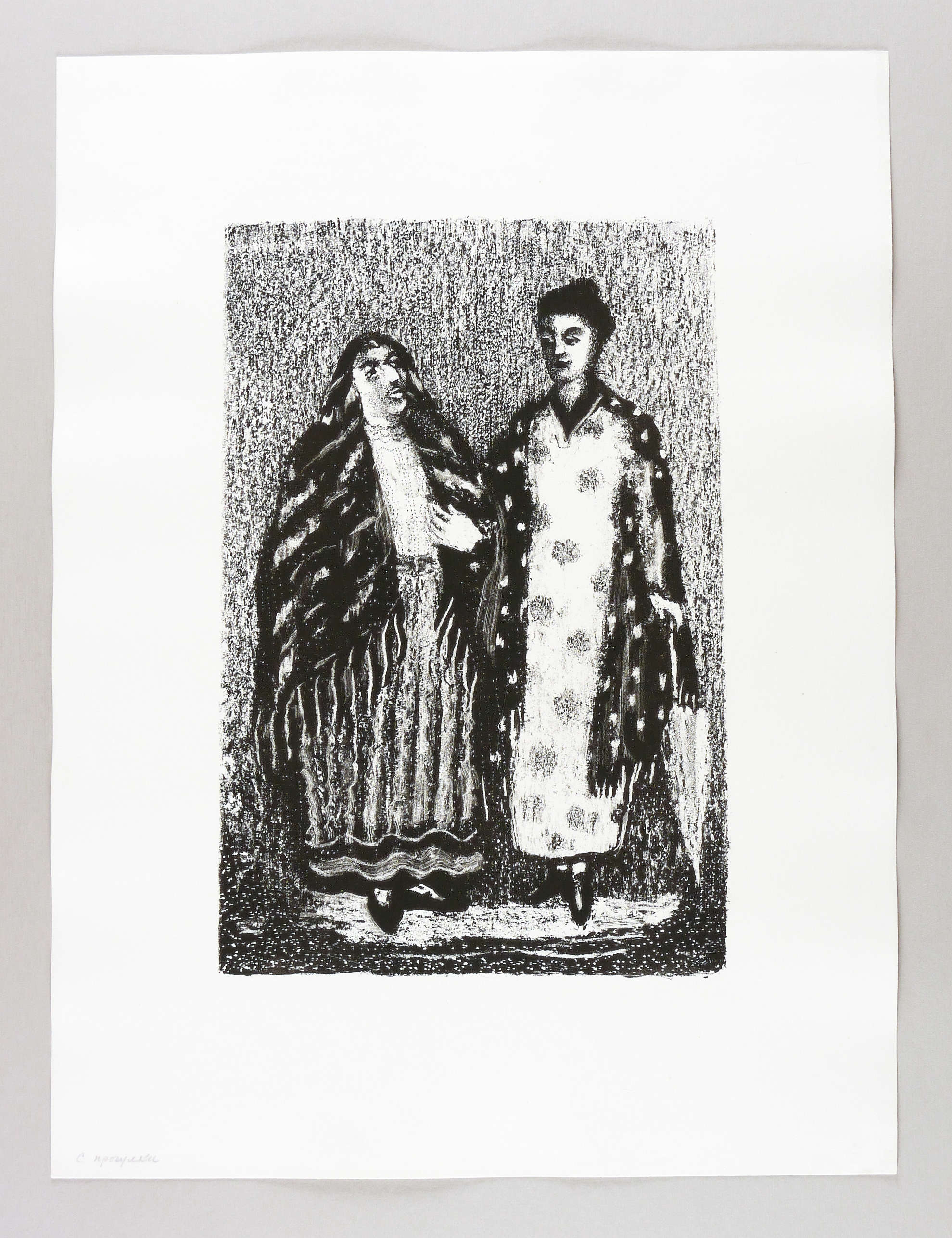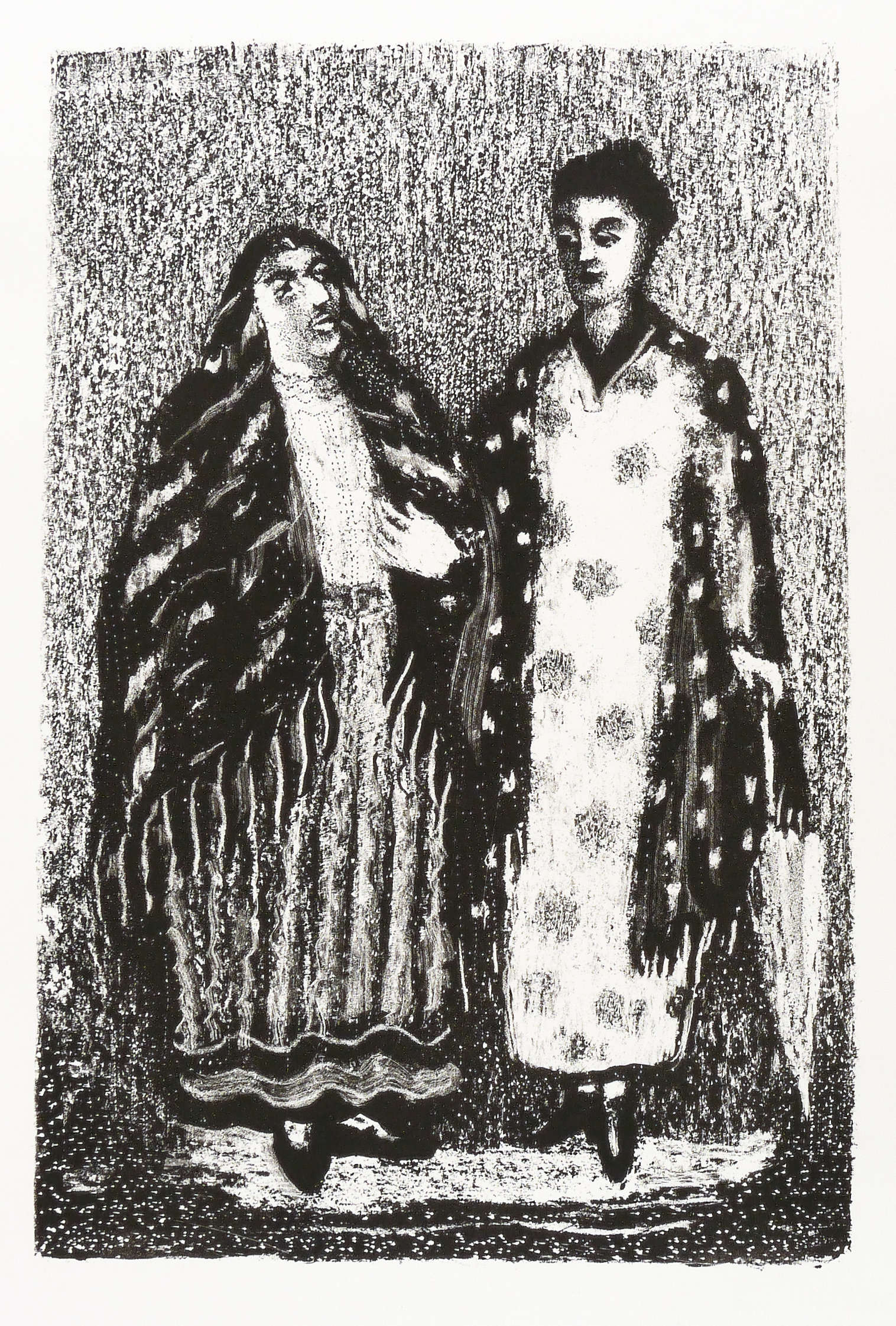 Mayer-Strodt V 9 b. – Nicht handsigniert. Links unten in Bleistift vom Künstler kyrillisch bezeichnet, etwa: ″С прогулки″. – Zweiter Zustand des Steins ohne das Wandbild im Hintergrund. - Abzug außerhalb der Auflage von 125 Exemplaren zum lithografischen Mappenwerk ″Tewje, der Milchmann″ zu Scholem Alejchem (Moskau: Sovetskij Chudoznik 1961/1966). Druck wohl in Leningrad. - Die etwas spätere Edition als illustriertes Buch (Dresden: Verlag der Kunst 1967) wurde als ″Schönstes Buch der DDR 1967″ ausgezeichnet. - Seltenes Blatt. – Sehr guter Zustand.