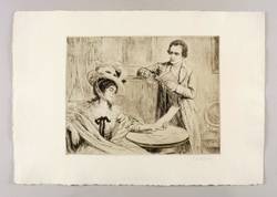 Um 1920. Radierung / Strichätzung, in Schwarzbraun, auf gelbem Kupferdruckkarton. – Originale Künstlergrafik, von Karl Bauer. – 25,8 x 33,3 cm (Darstellung / Platte), 38 x 54 cm (Blatt).