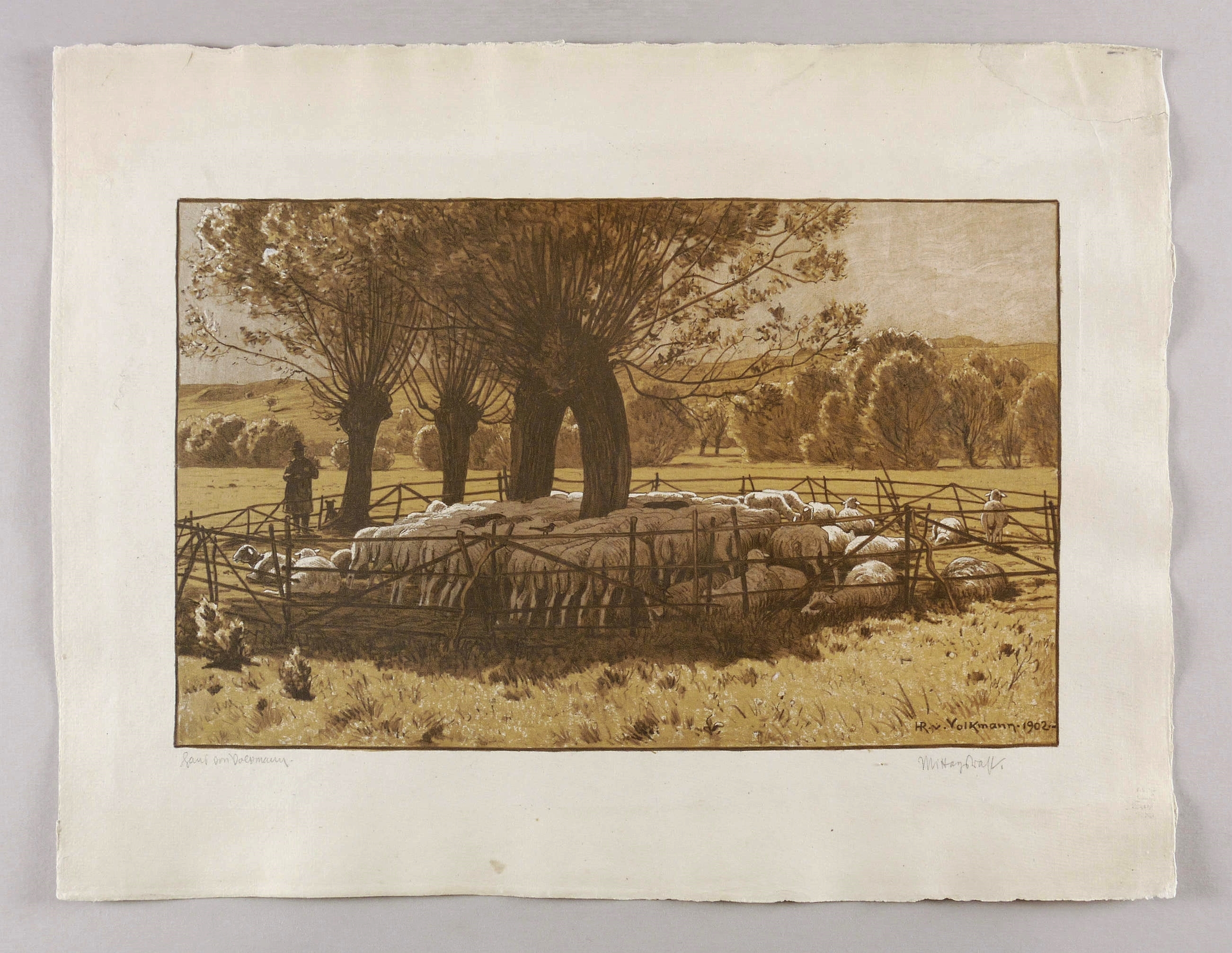 Hans Richard von Volkmann (1860 Halle/Saale - 1927 Halle/Saale). Deutscher Landschaftsmaler und Grafiker. Mitglied der Schwälmer Willingshäuser Malerkolonie. 1880-88 Studium an der Akademie in Düsseldorf. 1892 als Meisterschüler von Gustav Schönleber dem Älteren 1892 an der Kunstschule in Karlsruhe. Entwickelte sich dort zum bedeutendsten Vertreter der sogenannten Karlsruher Landschaftsschule. Seine Farblithografien und Radierungen gehören neben denen von Hans Thoma zum Besten, was diese Schule hervorbrachte.